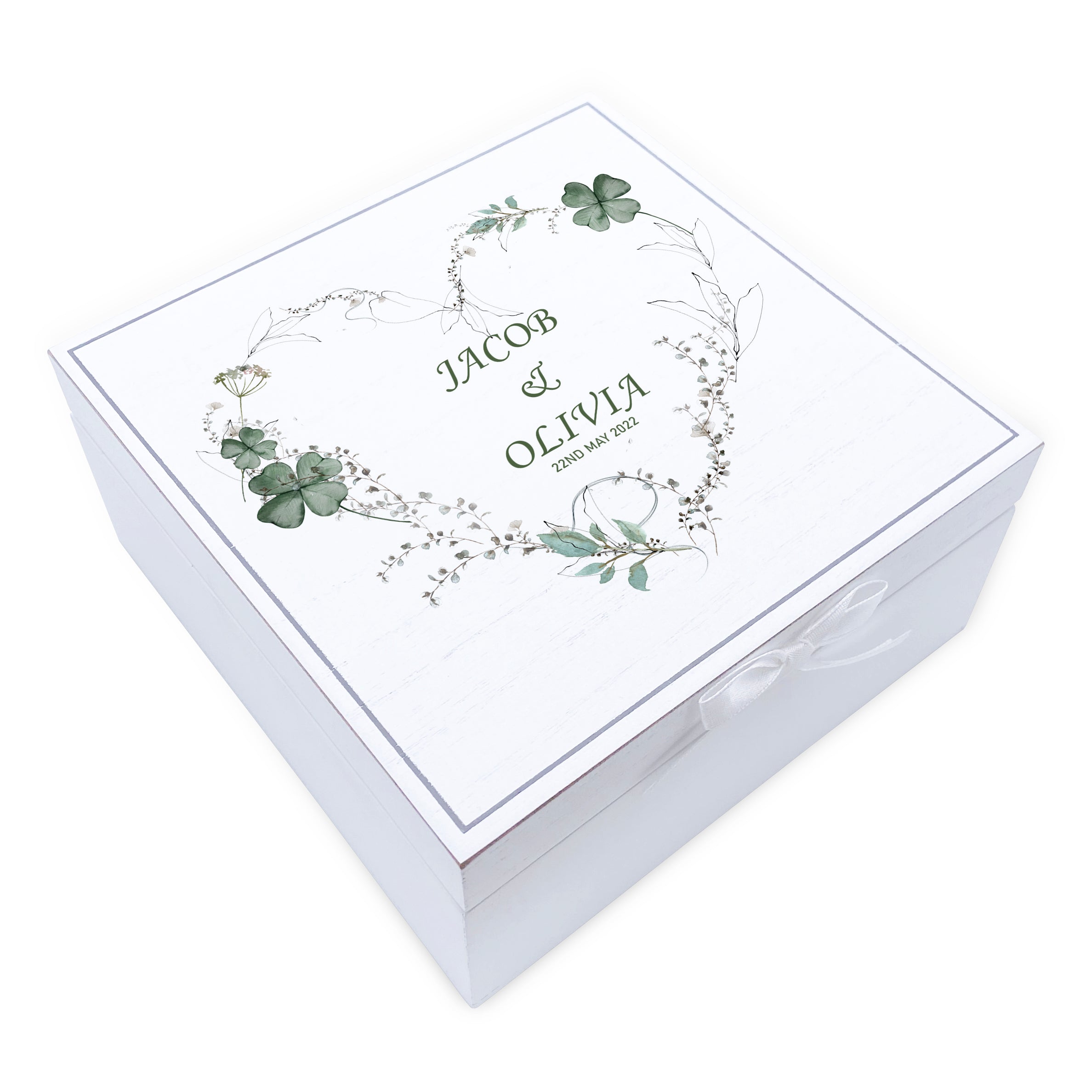 Personalised Wedding Day Vintage Wooden Keepsake Box Gift With Green Clover Heart Print