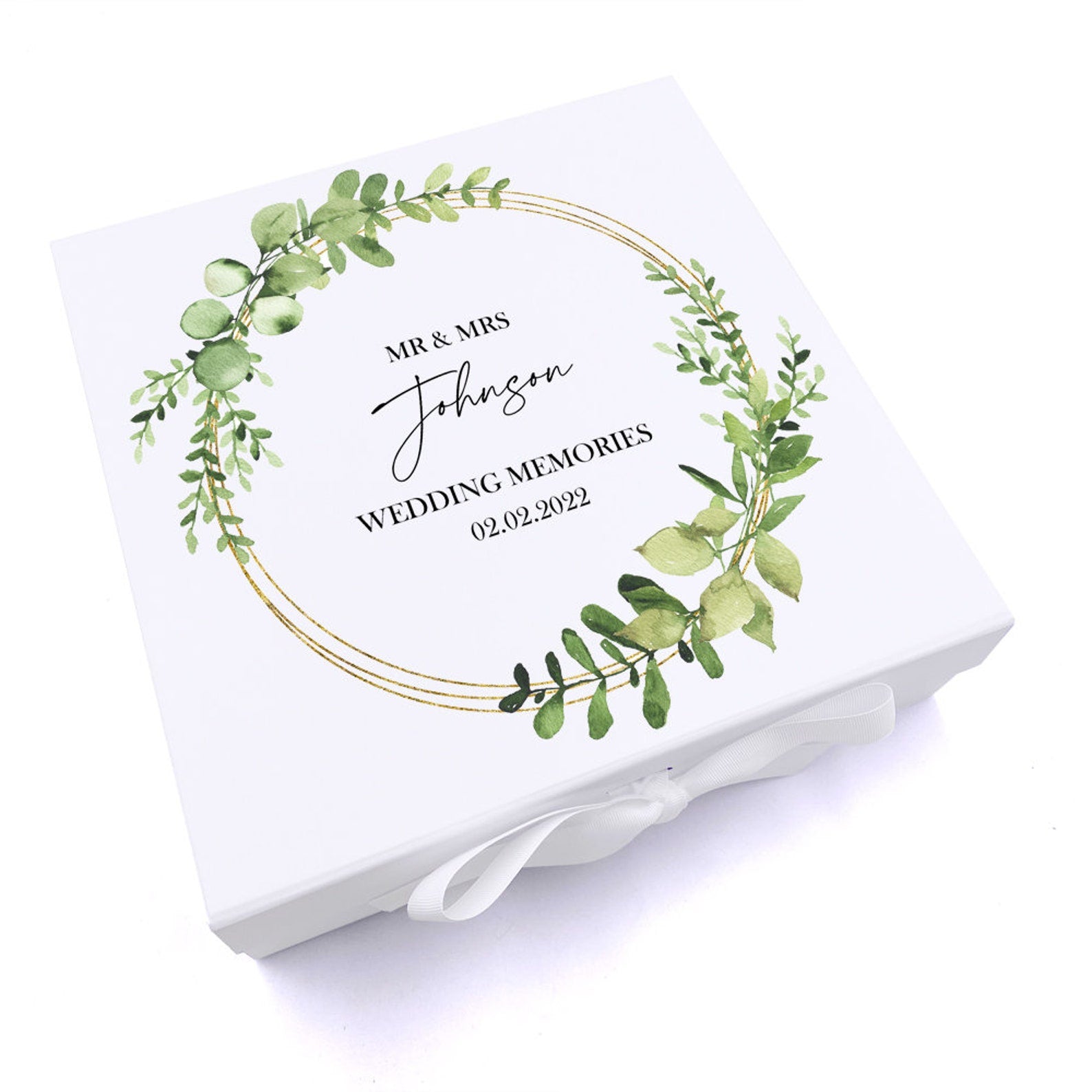 Commemorate a couple’s special day with this beautifully personalised wedding keepsake box, featuring an elegant eucalyptus and gold wreath design. Expertly crafted, the box offers a sophisticated storage solution for preserving treasured wedding mementos such as invitations, photos, and other meaningful keepsakes. The combination of natural eucalyptus motifs and shimmering gold accents creates a timeless, refined look that complements any décor. Personalisation adds a bespoke touch, transforming this keepsake box into a heartfelt gift that the newlyweds will cherish as a lasting reminder of their wedding day and the memories they create together.