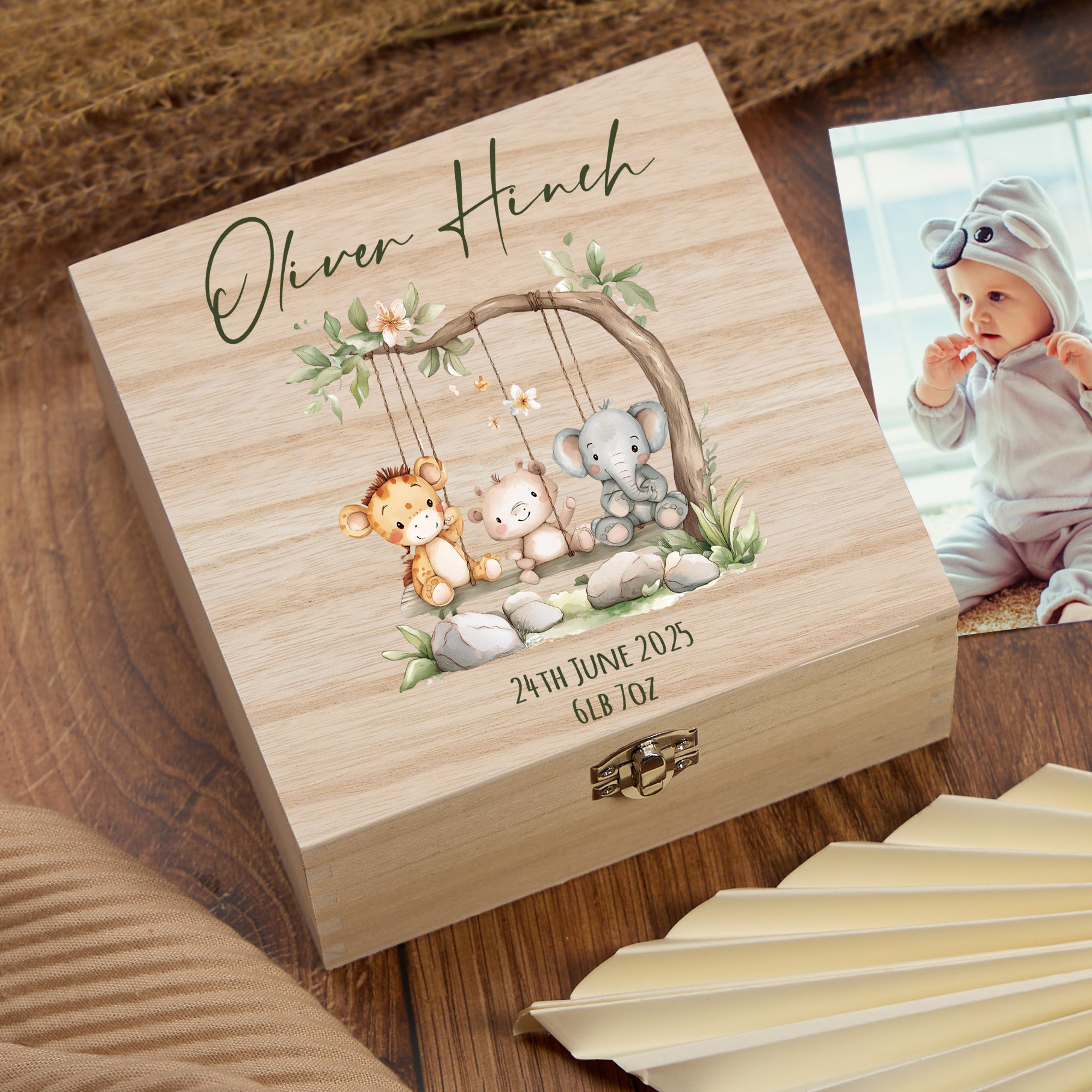 Crafted from quality wood, this personalised baby keepsake memory box offers a beautiful and durable solution for preserving your most treasured mementos. Designed to hold 6" x 4" photos and other significant keepsakes, it features a hinged lid for smooth access and a secure clip closure to keep contents safe. The elegant leaf design adds a touch of sophistication, making it a meaningful gift or a cherished addition to your home. With dimensions of 17 x 17 x 7 cm, this box provides ample space while maintaining a compact, stylish profile.