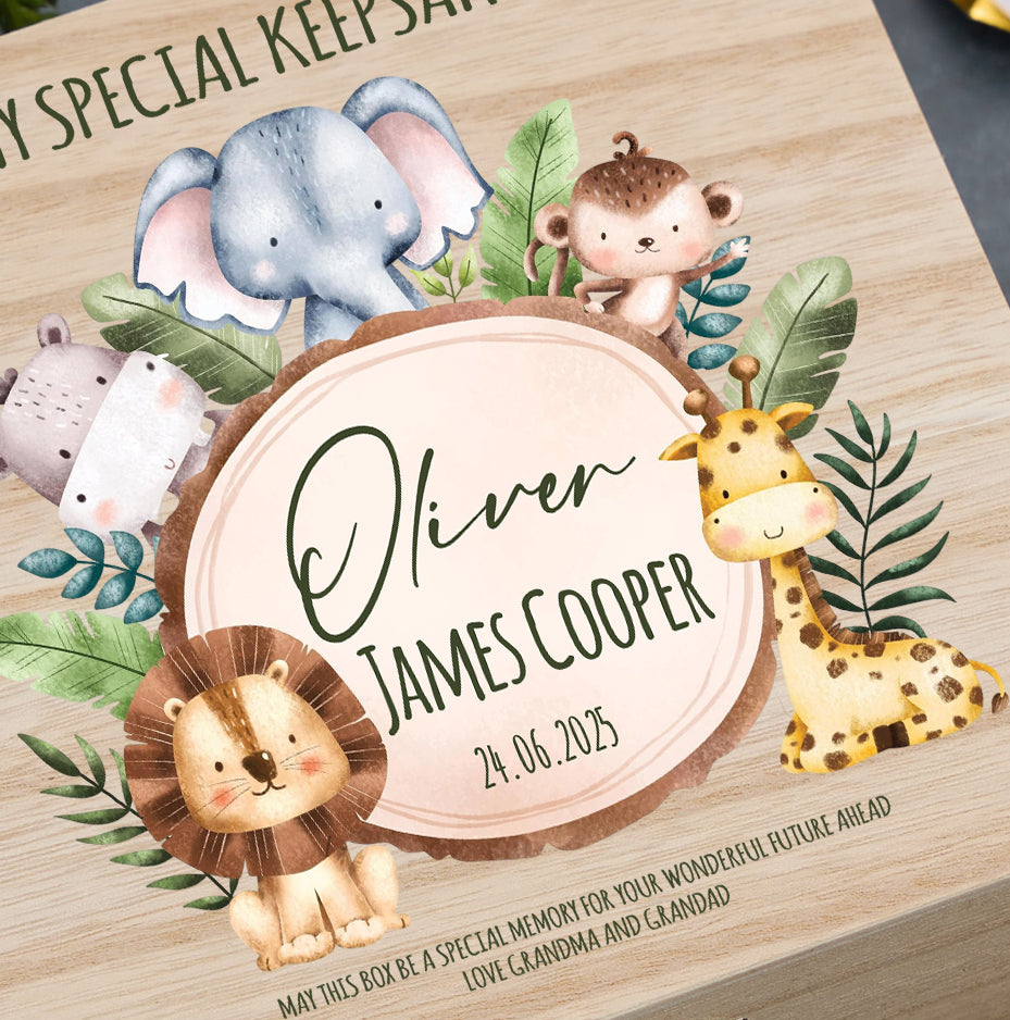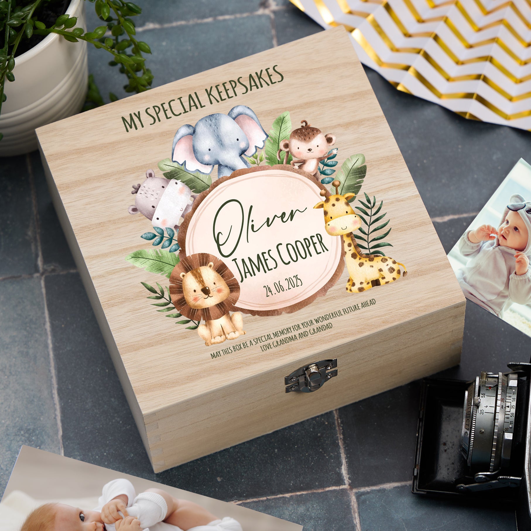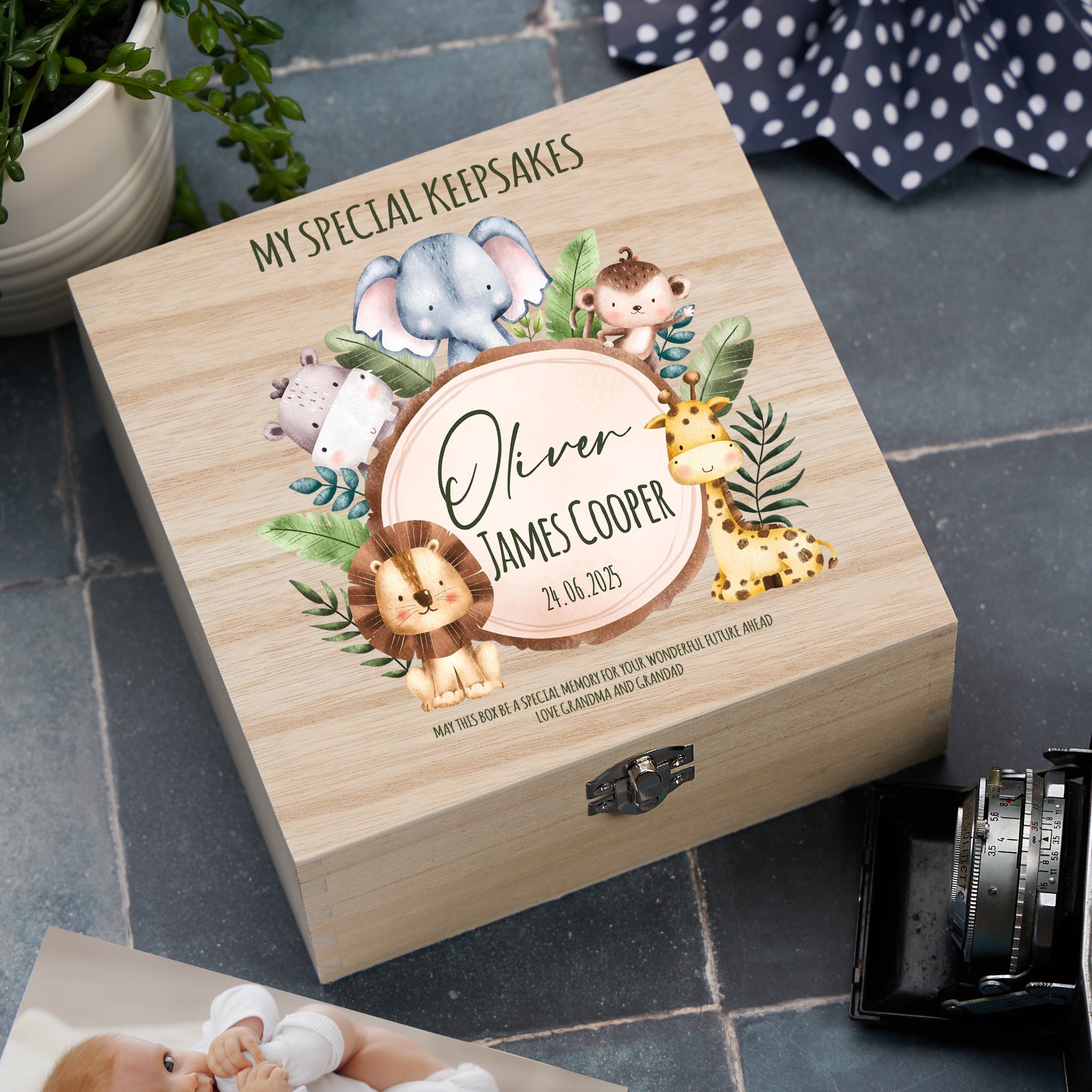 Crafted from quality wood, this personalised baby keepsake memory box offers a beautiful and durable solution for preserving your most treasured mementos. Designed to hold 6" x 4" photos and other significant keepsakes, it features a hinged lid for smooth access and a secure clip closure to keep contents safe. The elegant leaf design adds a touch of sophistication, making it a meaningful gift or a cherished addition to your home. With dimensions of 17 x 17 x 7 cm, this box provides ample space while maintaining a compact, stylish profile.