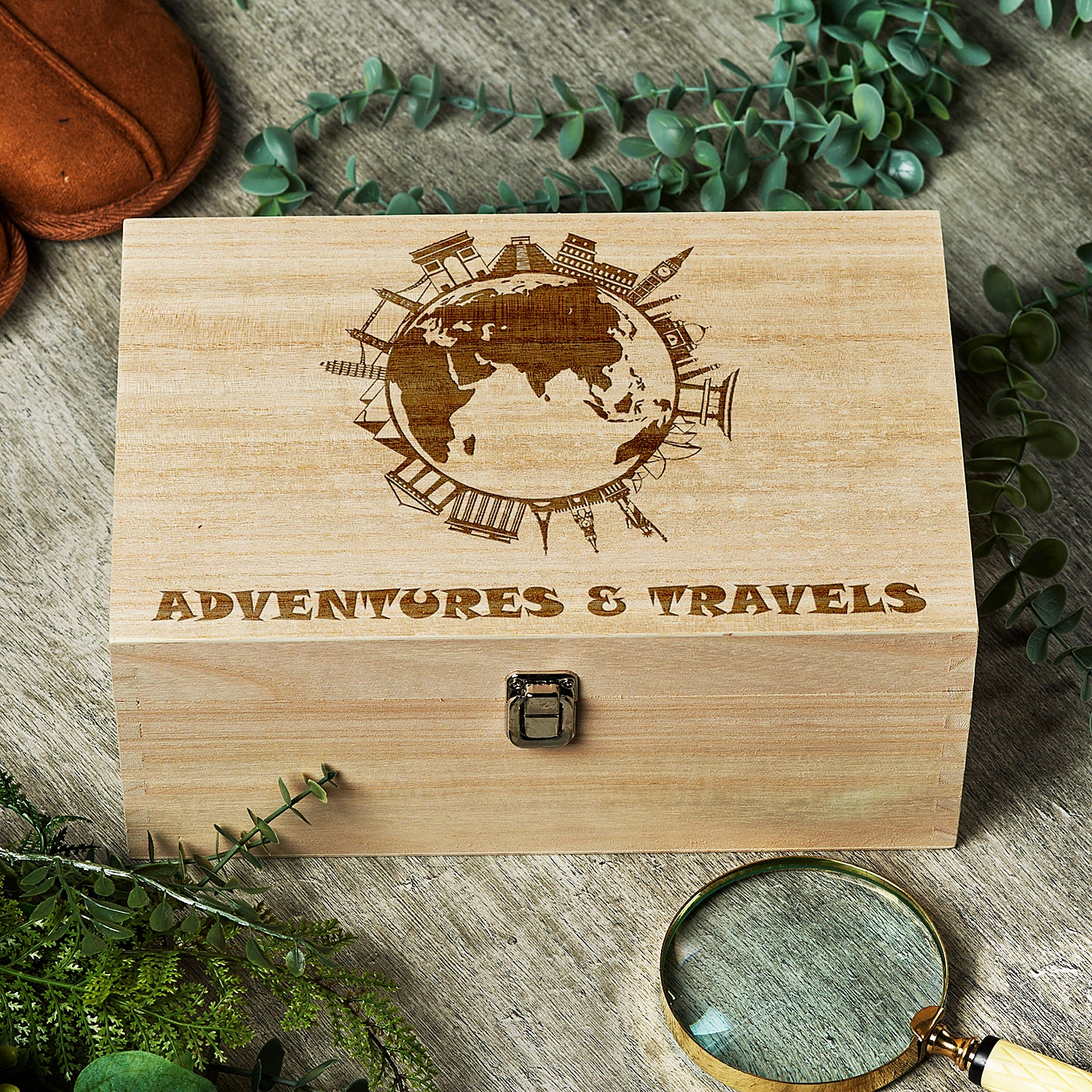 Adventure and Travels Wooden Keepsake Box Beautiful way to help mum share those special moments. Made from wood this box is an ideal way to store little memrobelias. The box is hinged for easy opening and comes with a clip closure. Dimensions: 30 x 20 x 13 cm (11.8 x 7.9 x 5.1 inches)