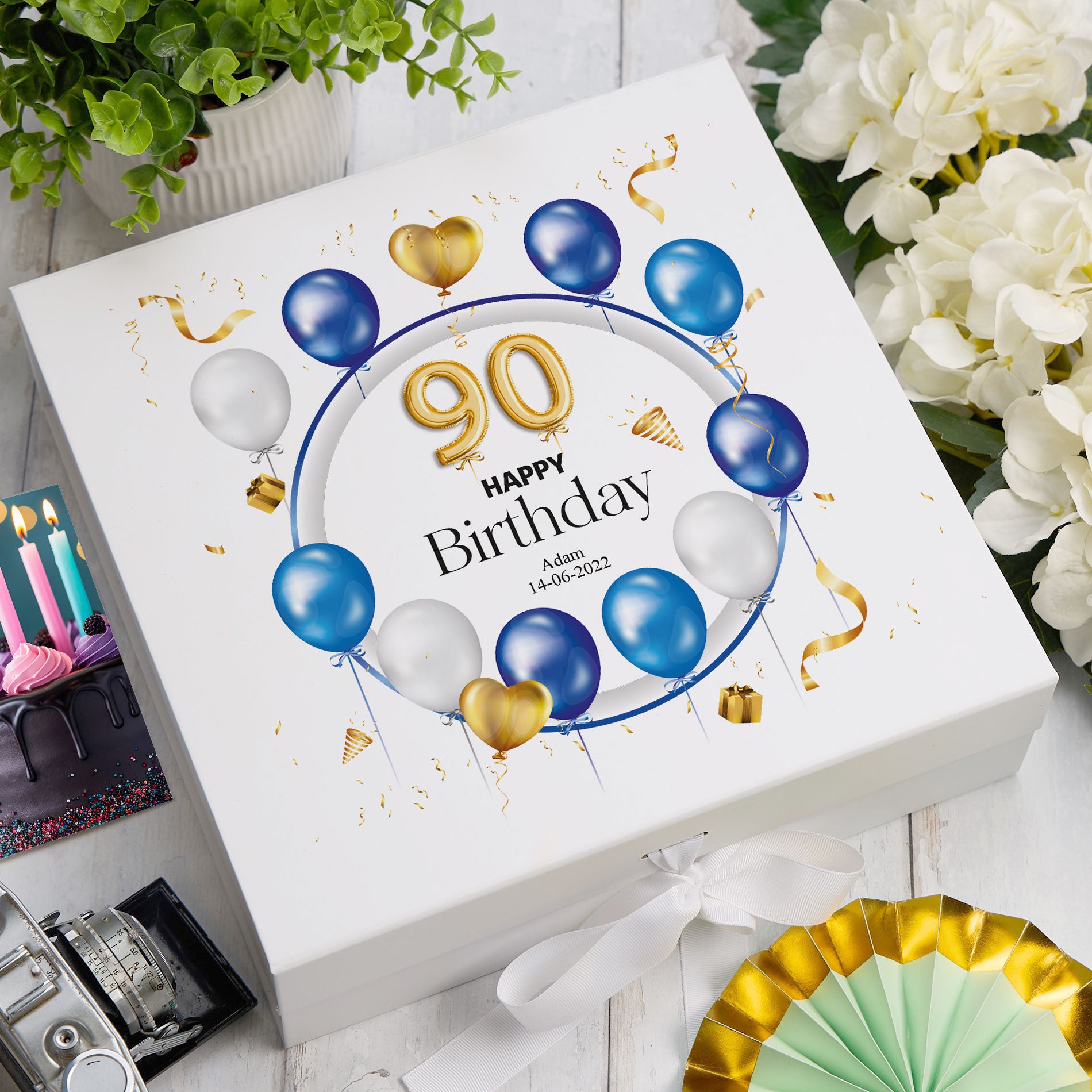 Luxury 90th Birthday Personalised Memory Box With Blue Balloons - Magnetic Closure & Grosgrain Ribbon. The personalised...