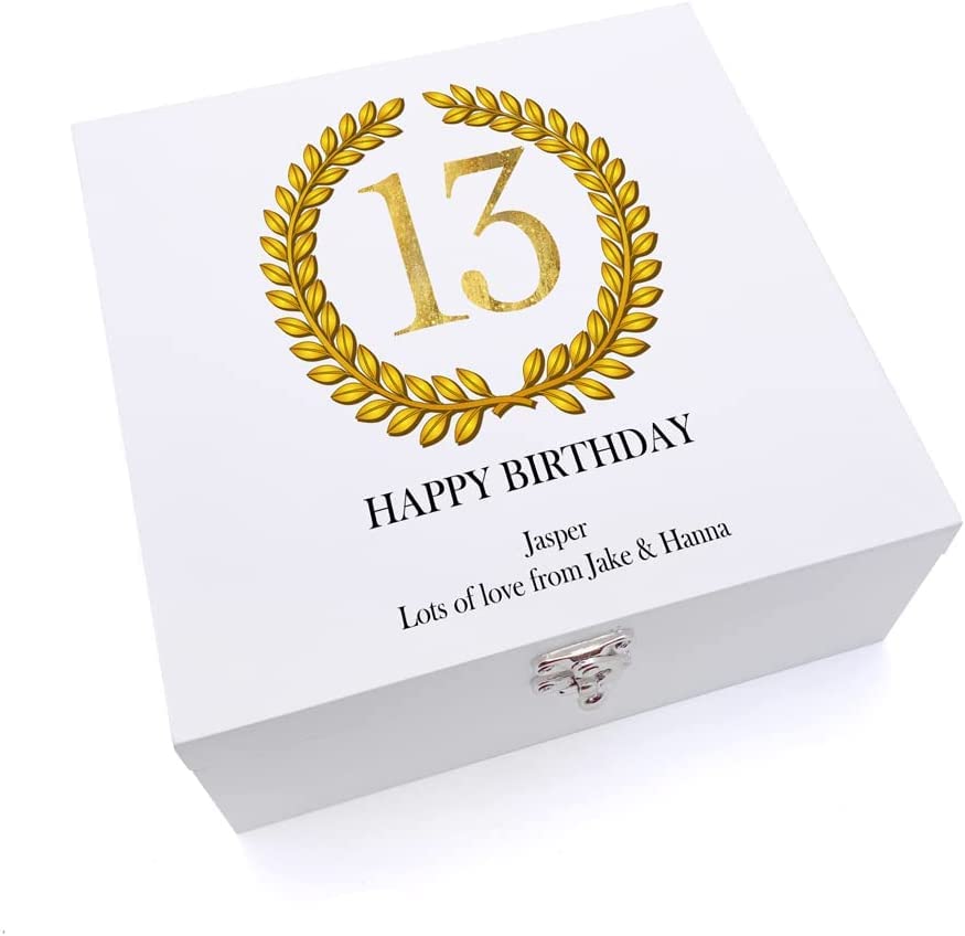 Personalised 13th Birthday Gift for Him Keepsake Large Wooden Box Gold Wreath Design. A contemporary luxury white...