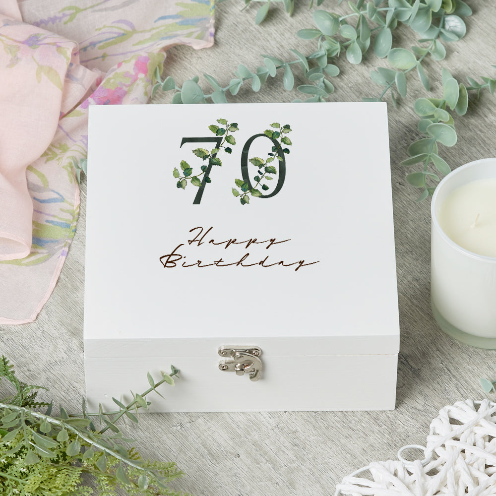 70th Birthday Green Leaf Design Keepsake Wooden Gift Box. A contemporary luxury white wooden memory box, personalised...
