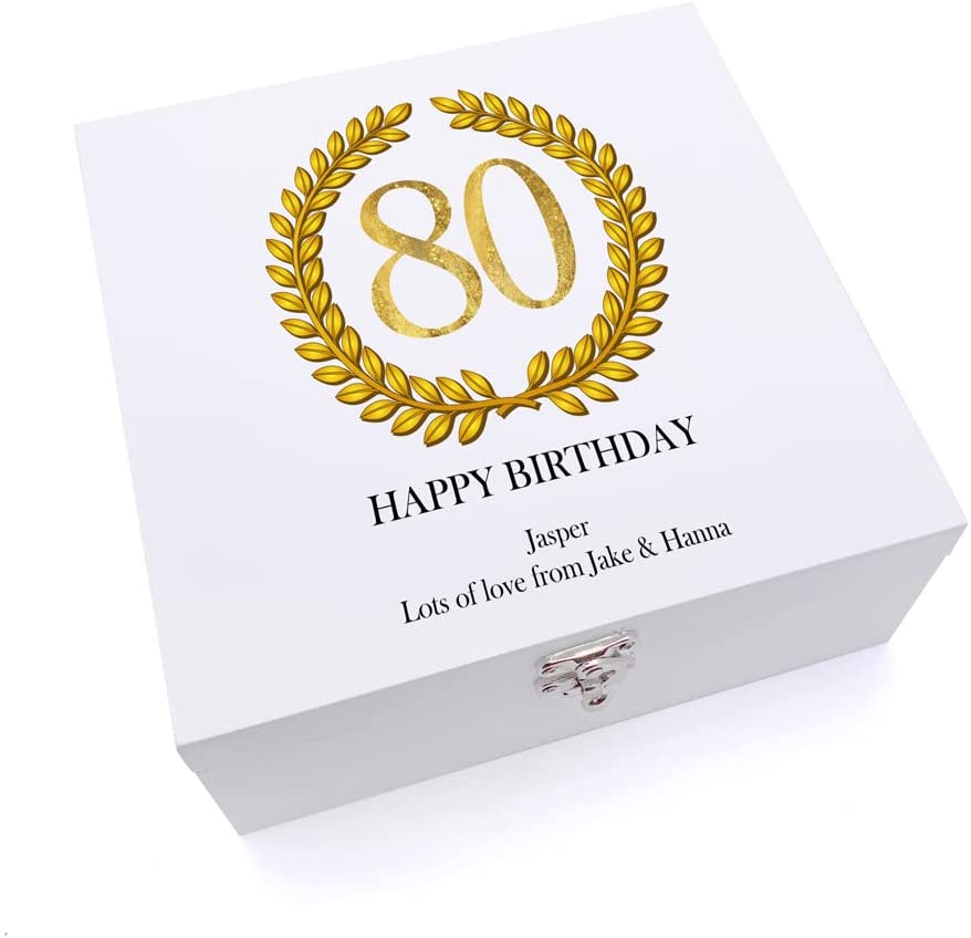 ukgiftstoreonline Personalised 80th Birthday Gift for Him Keepsake Wooden Box Gold Wreath Design
