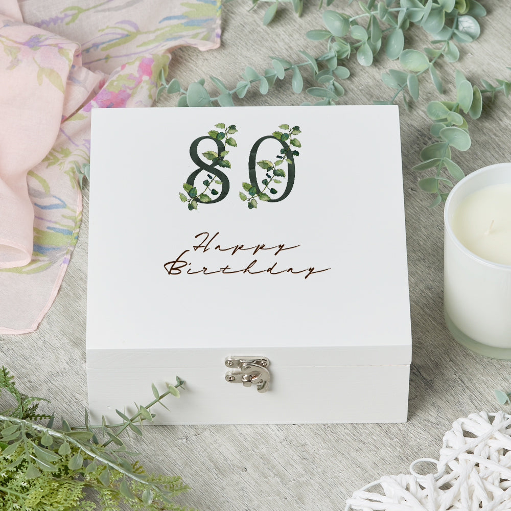 Special 80 birthday leaf keepsake wooden gift box. A contemporary luxury white wooden memory box, personalised for...