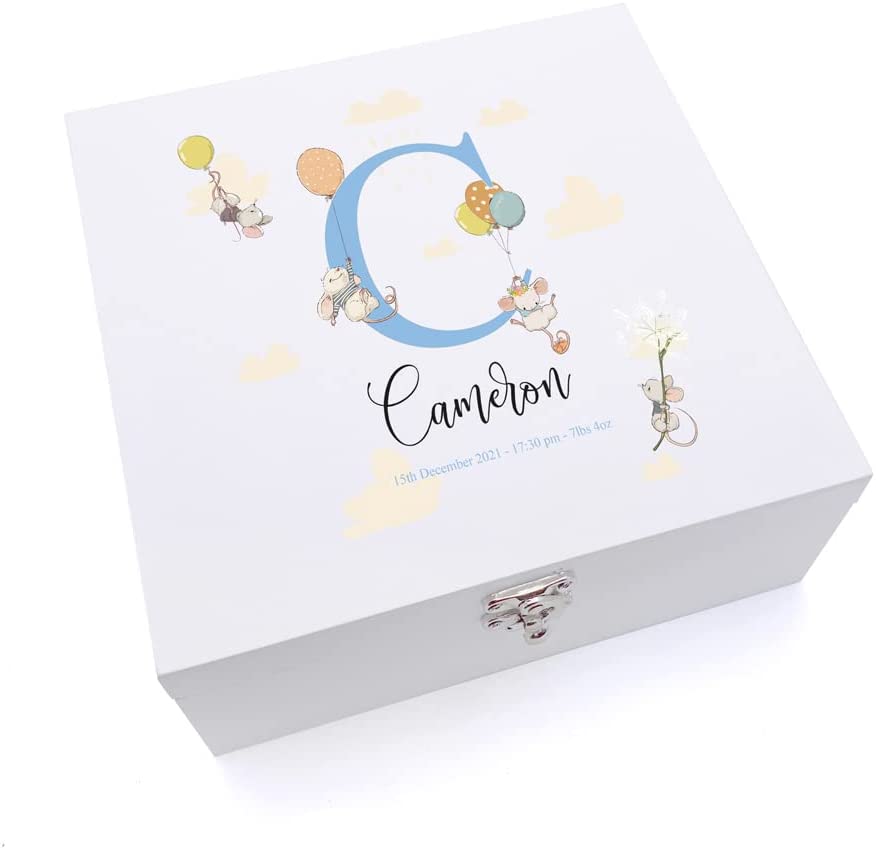 Perfect to fill with gifts, photos and other bits and bobs. Made from a white coated wood with your details printed directly onto the lid using the latest printing technology. The inside of the box has a natural wood finish. The boxes have beautiful chrome plated metal hinges and clasp to hold shut ensuring they last for years.