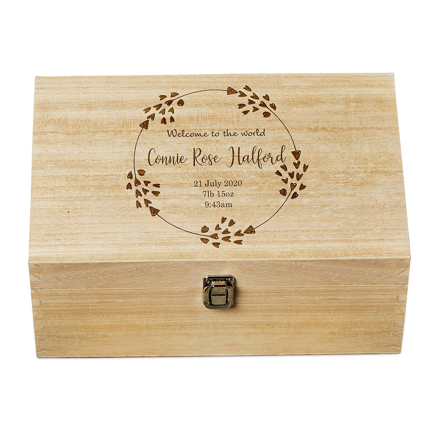 Beautiful Memories keepsake Made from wood this box is an ideal way to store those important keepsakes. The box is hinged for easy opening and comes with a clip closure. Dimensions: 30 x 20 x 13 cm (11.8 x 7.9 x 5.1 inches) The personalisation is done with a laser engraver directly onto the wood giving it a lovely finish. All you have to do is add a message during checkout.