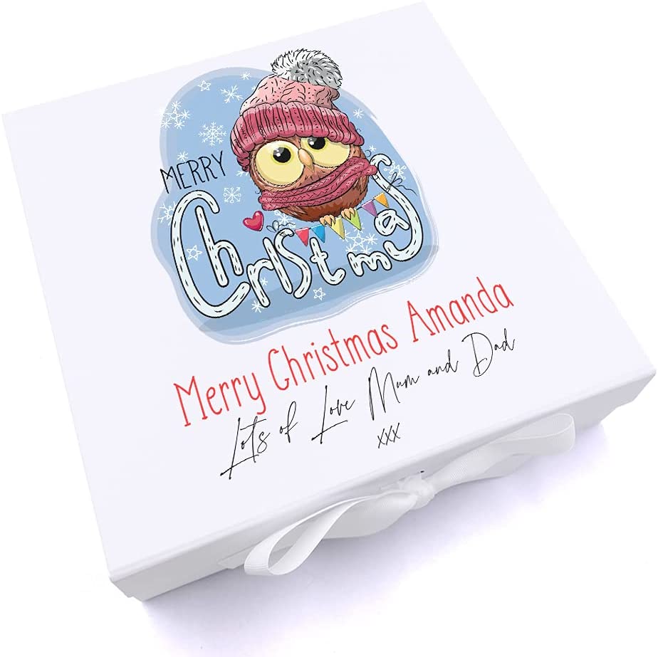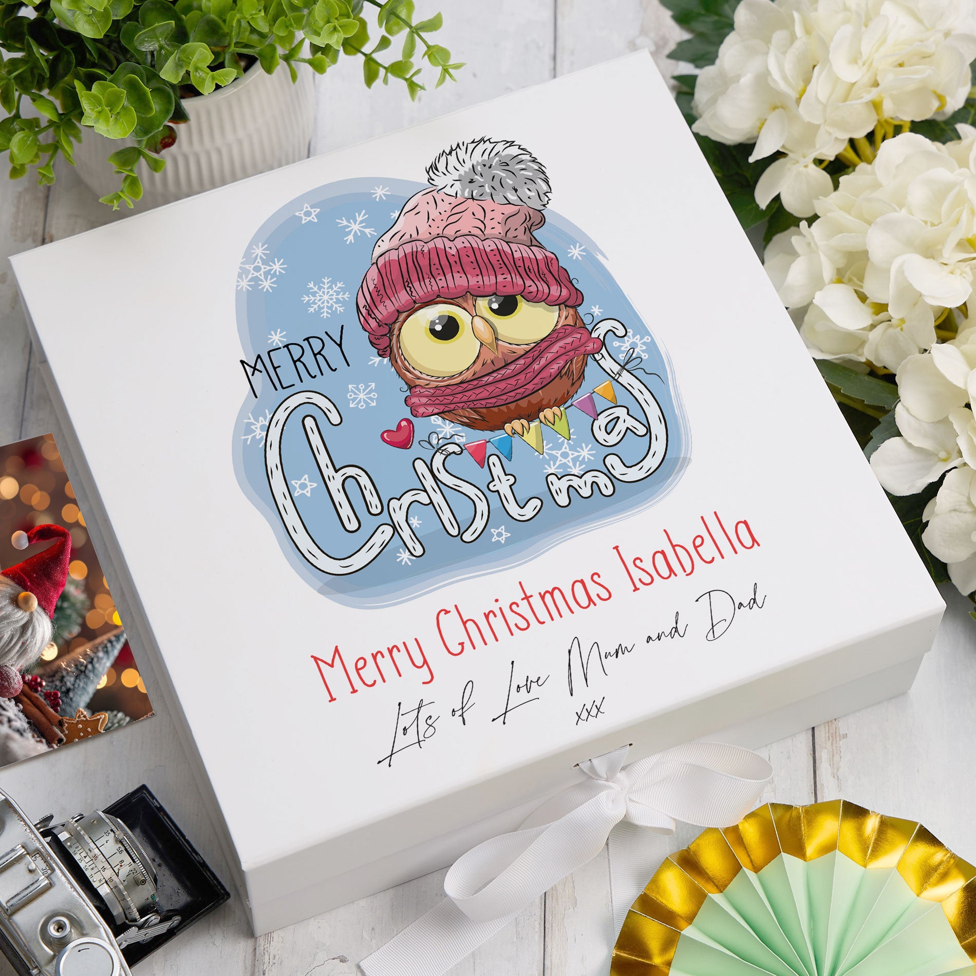 A charming keepsake box featuring a festive owl design, personalised to treasure your baby's first Christmas memories and precious early milestones in one cherished keepsake.