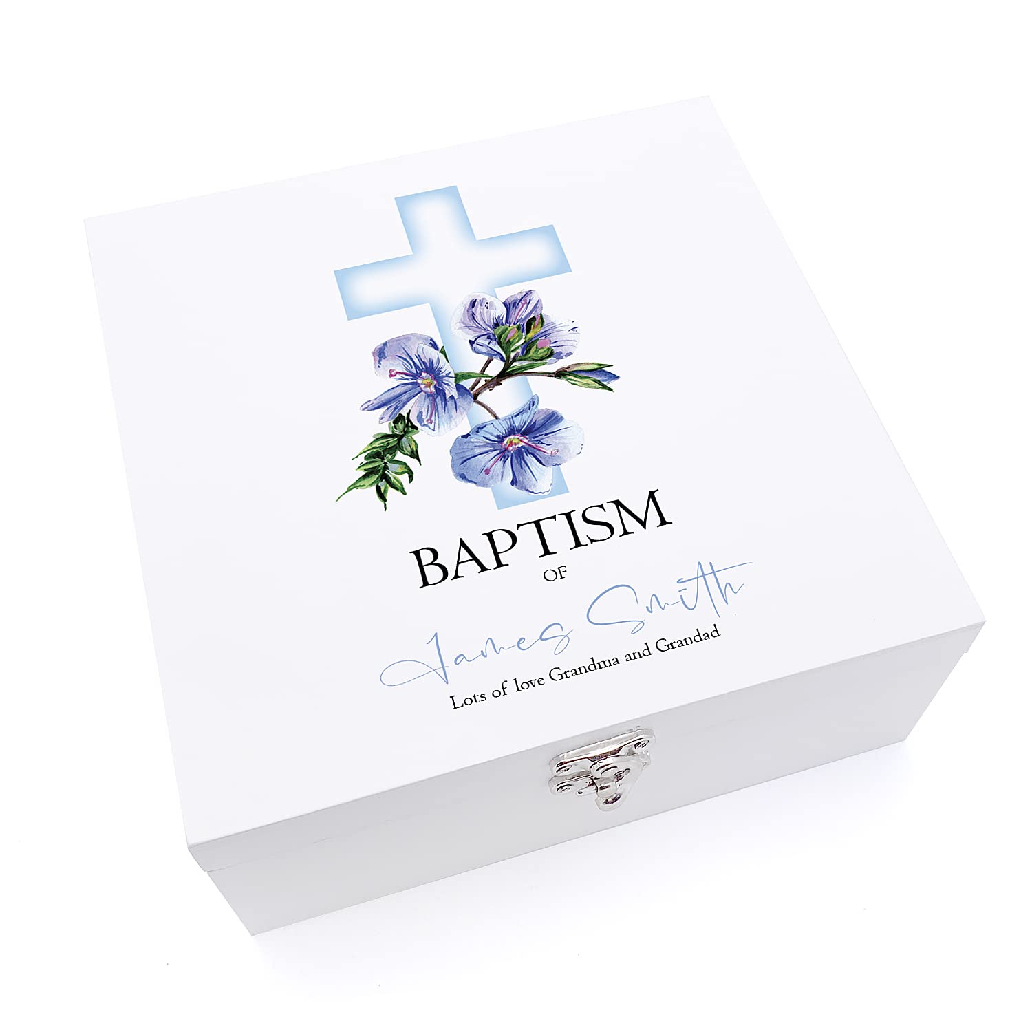 Perfect to fill with gifts, photos and other bits and bobs. Made from a white coated wood with your details printed directly onto the lid using the latest printing technology. The inside of the box has a natural wood finish. The boxes have beautiful chrome plated metal hinges and clasp to hold shut ensuring they last for years. Available in two sizes: Medium: H8 x W20 x D20 cm Large: H9 x W30 x D30 cm