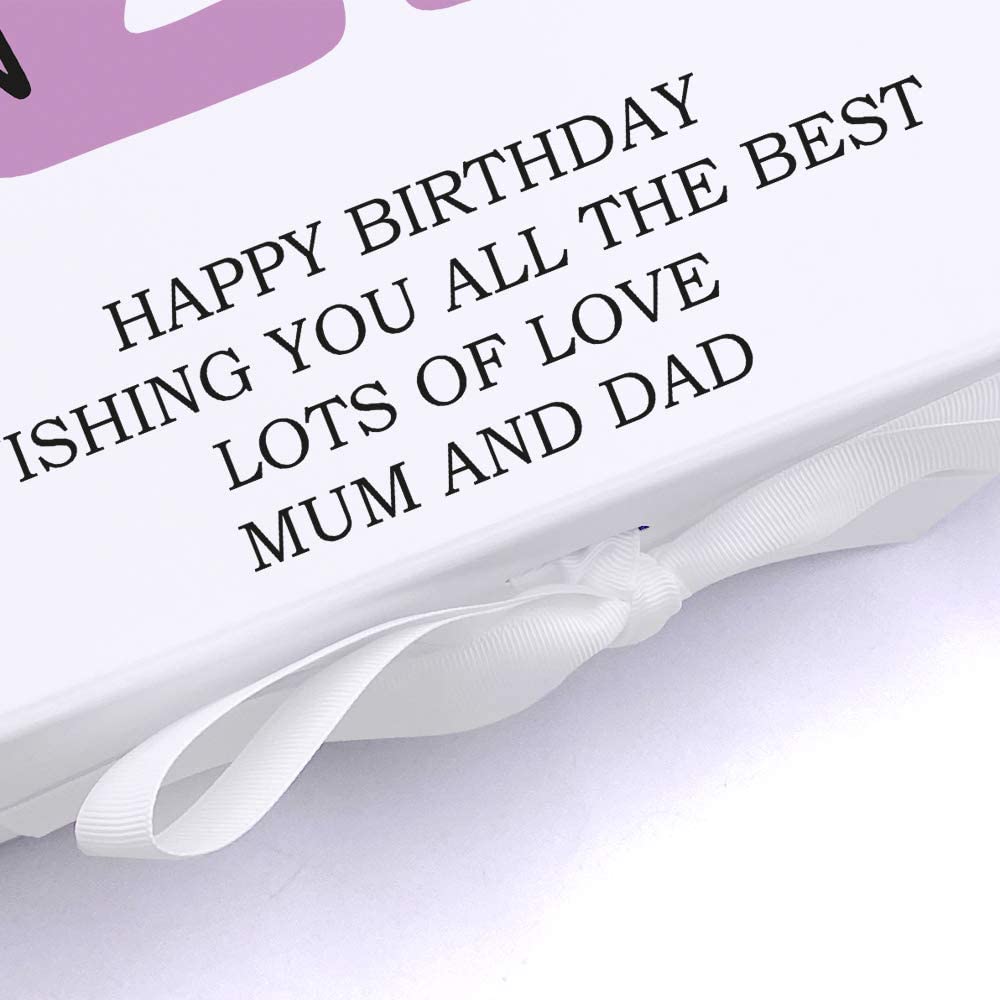 The personalised print on this luxury box is raised slightly to create a stunning embossed-style feature. The box itself is sturdy and durable - made from a luxurious 1200gsm white matt laminated rigid board. Available in two sizes and used as a gift box, as a memory box or as part of a hamper. Medium 17cm x 17cm x 8cm Large 30cm x 30cm x 9cm It can be used as a gift box, as a memory box or as part of a hamper.