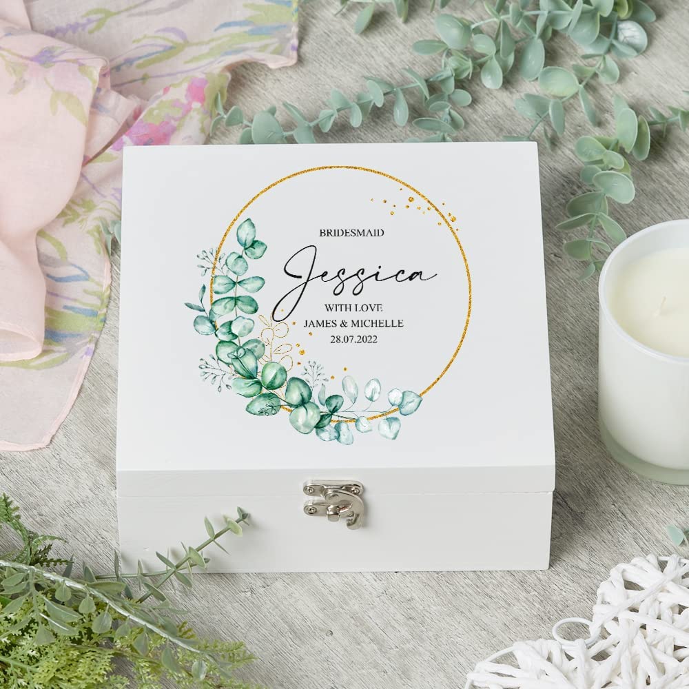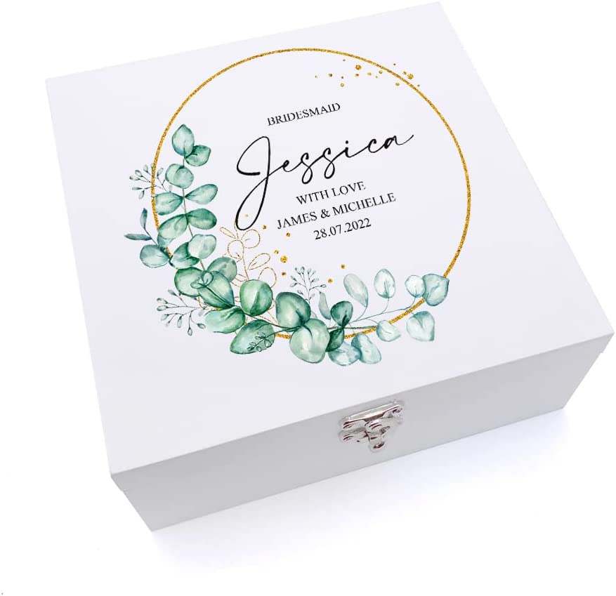 A contemporary luxury white wooden memory box, personalised for the occasion If you are looking for an extra special gift then these keepsake boxes are sure to be cherished and filled with mementos along the years. Perfect to fill with gifts, photos and other bits and bobs. Made from a white coated wood with your details printed directly onto the lid using the latest printing technology. The inside of the box has a natural wood finish. The boxes have beautiful chrome plated metal hinges and clasp to hold shut ensuring they last for years. Dimensions: H8 x W20 x D20 cm