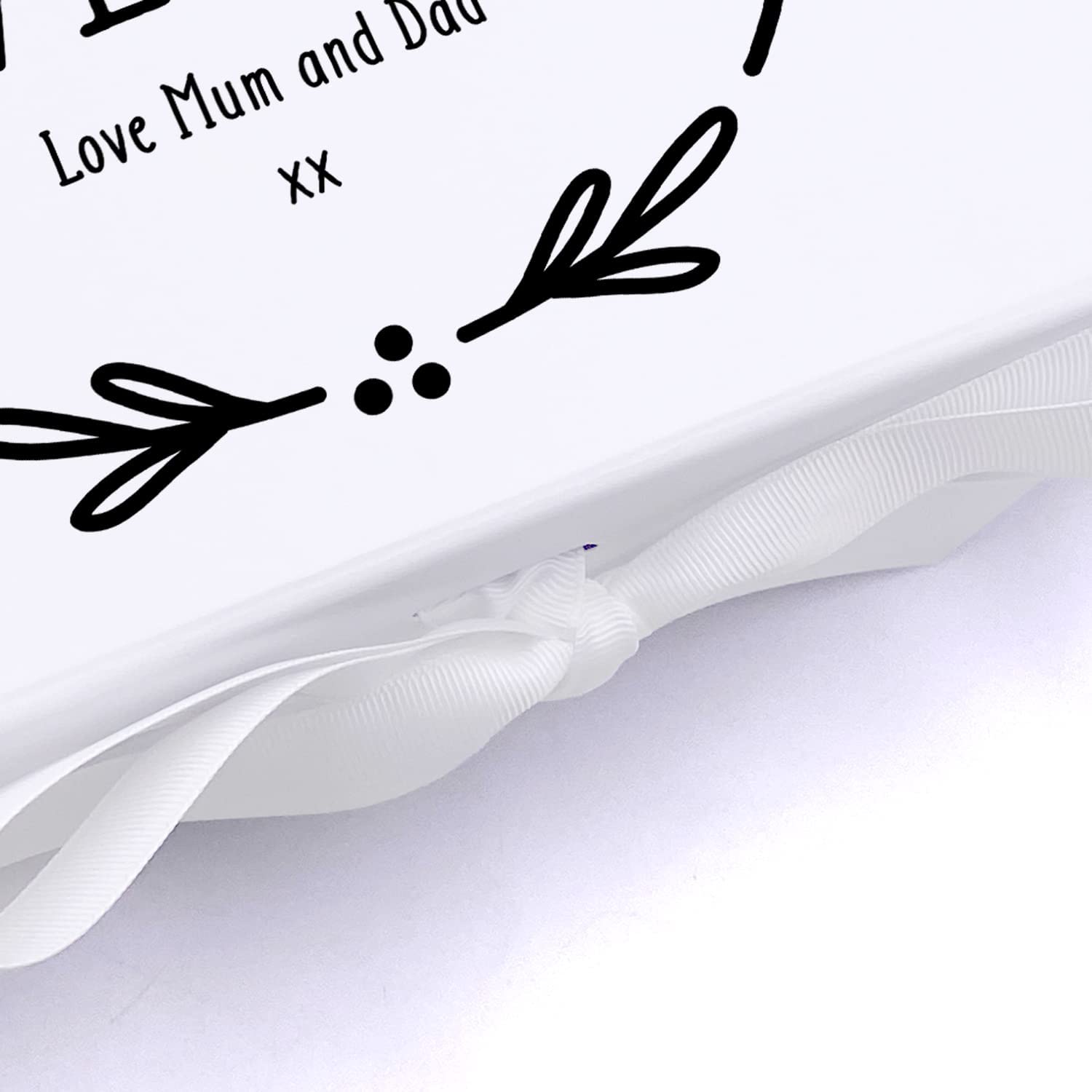 Gorgeous luxury personalised printed rigid card gift box, with lid that has a magnetic closure and is tied with a grosgrain ribbon. The personalised print on this luxury box is raised slightly to create a stunning embossed-style feature. The box itself is sturdy and durable - made from a luxurious 1200gsm white matt laminated rigid board.