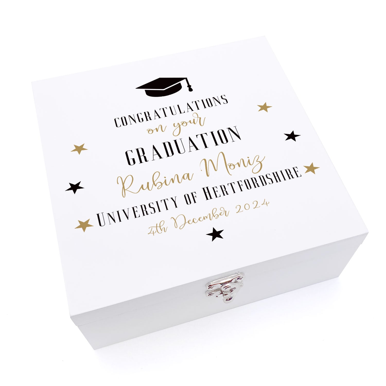 Perfect to fill with gifts, photos and other bits and bobs. Made from a white coated wood with your details printed directly onto the lid using the latest printing technology. The inside of the box has a natural wood finish. The boxes have beautiful chrome plated metal hinges and clasp to hold shut ensuring they last for years.
