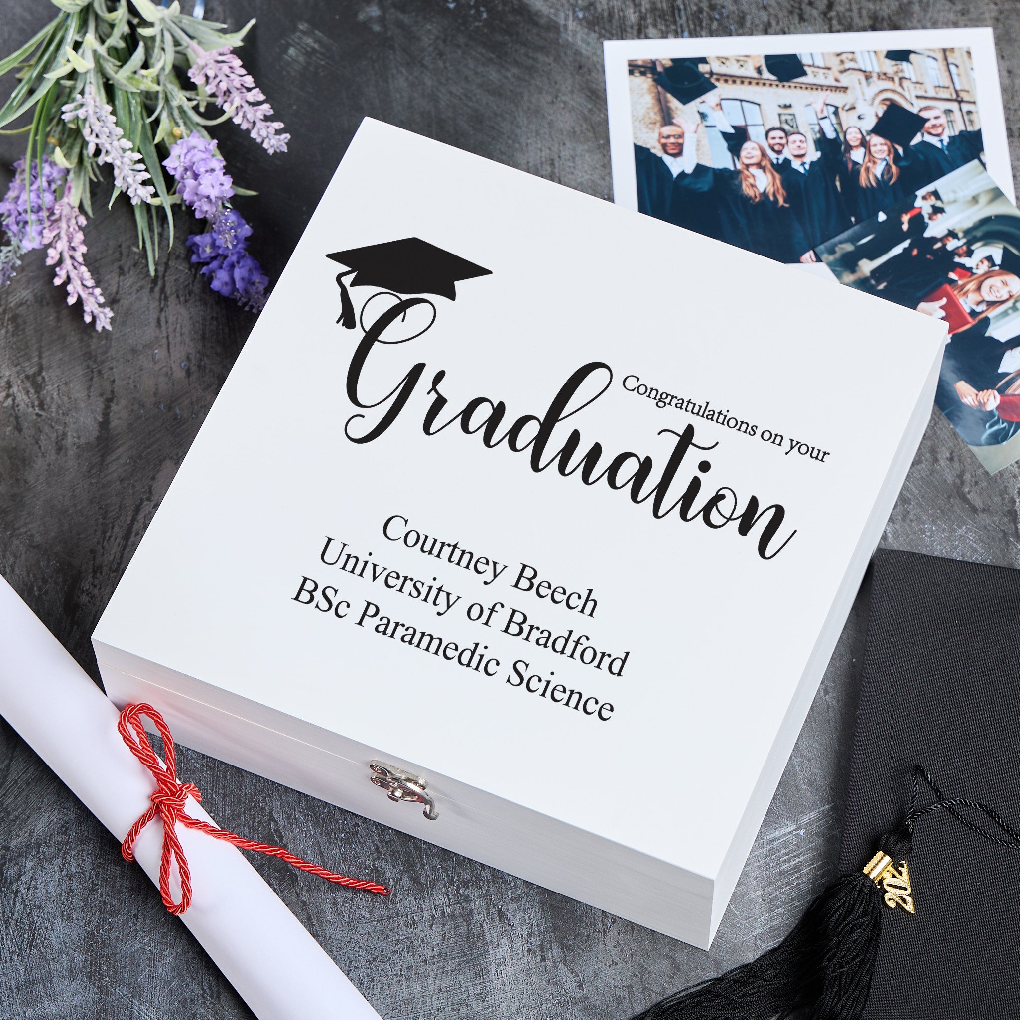 A contemporary luxury white wooden memory box, personalised for the occasion If you are looking for an extra special gift then these keepsake boxes are sure to be cherished and filled with mementos along the years. Perfect to fill with gifts, photos and other bits and bobs. Made from a white coated wood with your details printed directly onto the lid using the latest printing technology. The inside of the box has a natural wood finish. The boxes have beautiful chrome plated metal hinges and clasp to hold shut ensuring they last for years. Dimensions: H9 x W30 x D30 cm