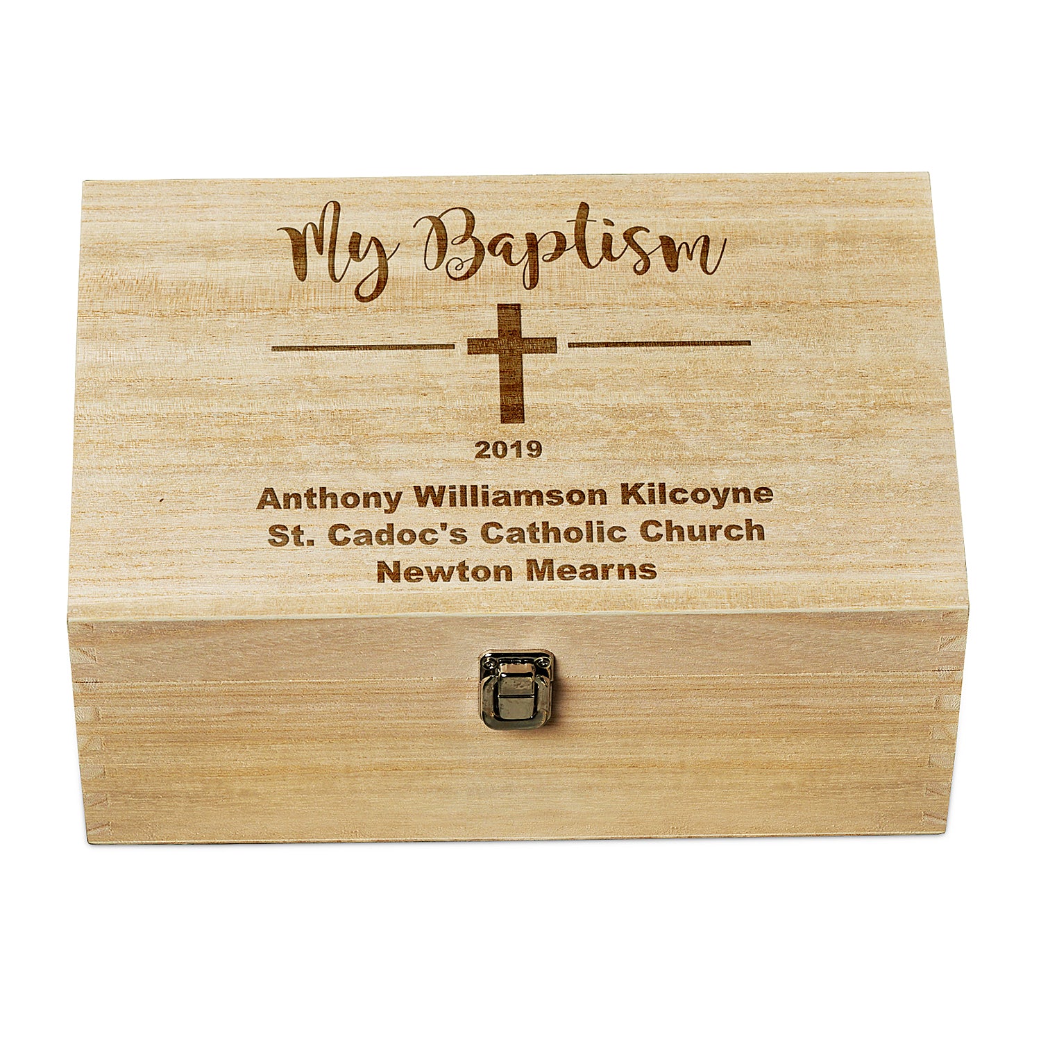 Beautiful Christening Box is a wonderful way of treasuring memories. Made from wood this box is an ideal way to store those important keepsakes. The box is hinged for easy opening and comes with a clip closure. Dimensions: 30 x 20 x 13 cm (11.8 x 7.9 x 5.1 inches) Comes with the wording "My Baptism "