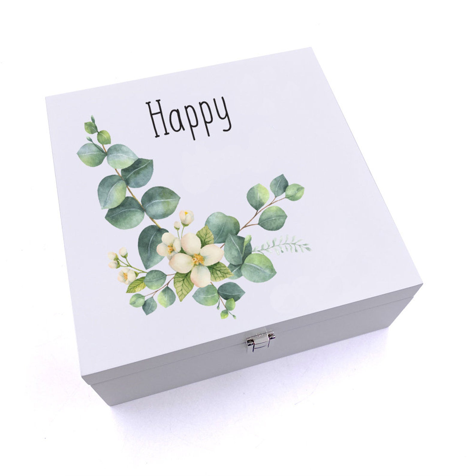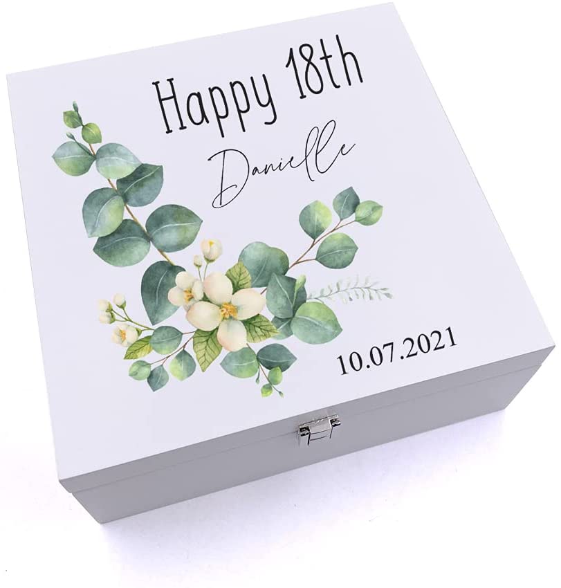 A contemporary luxury white wooden memory box, personalised with the name, age and date If you are looking for an extra special gift then these keepsake boxes are sure to be cherished and filled with mementos along the years. Perfect to fill with gifts, photos and other bits and bobs. Made from a white coated wood with your details printed directly onto the lid using the latest printing technology. The inside of the box has a natural wood finish. The boxes have beautiful chrome plated metal hinges and clasp to hold shut ensuring they last for years. Dimensions: H8 x W20 x D20cm