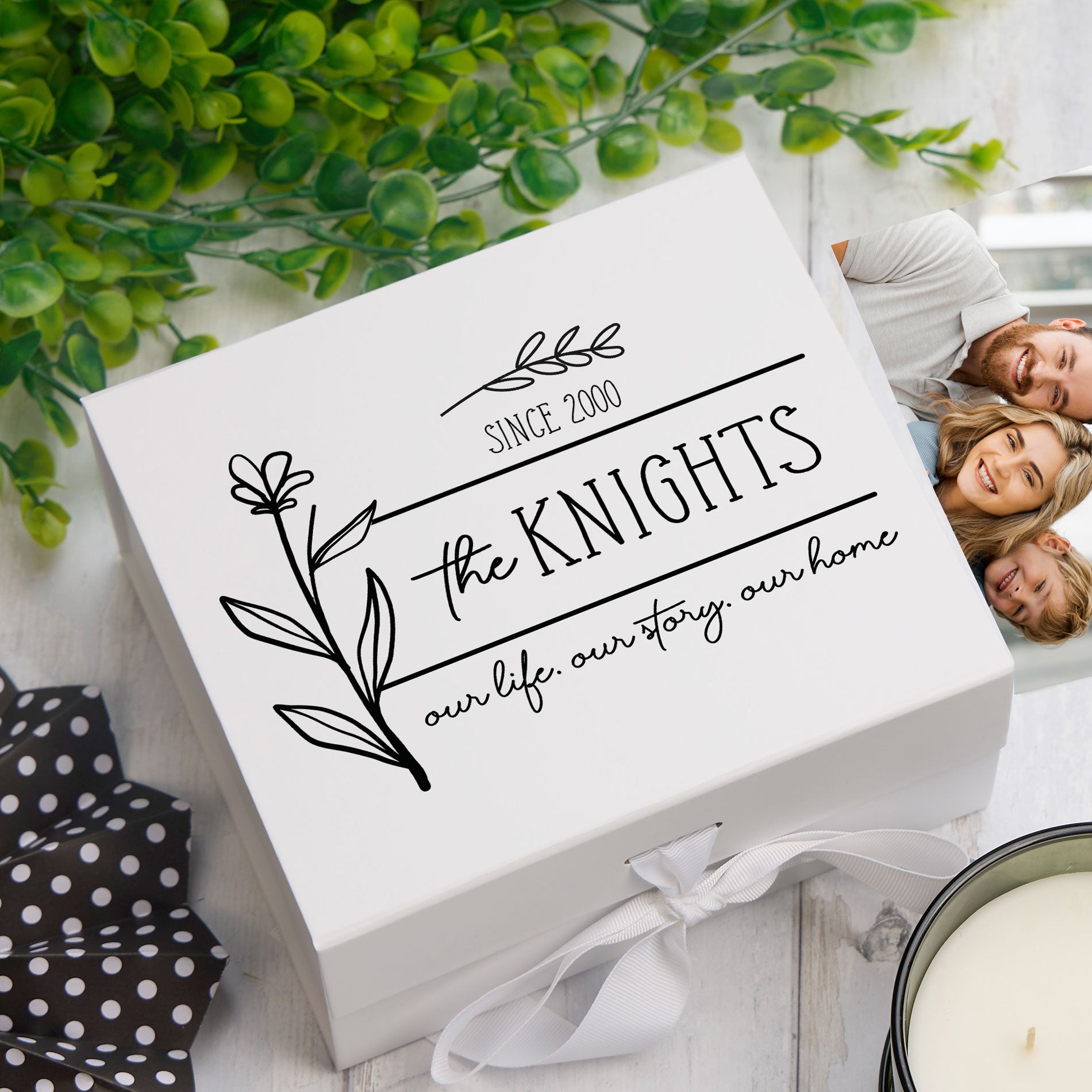 The Personalised Our Story Our Life Family Sentiment Keepsake Memory Box is a heartfelt way to preserve your family's most treasured moments. Customisable with your family name or a special sentiment, this memory box symbolises your unique journey together. Designed to hold photos, letters, and keepsakes, it keeps your family’s story alive for future generations. Crafted with care and elegance, this box makes an ideal gift to celebrate the bonds that shape your life and memories.
