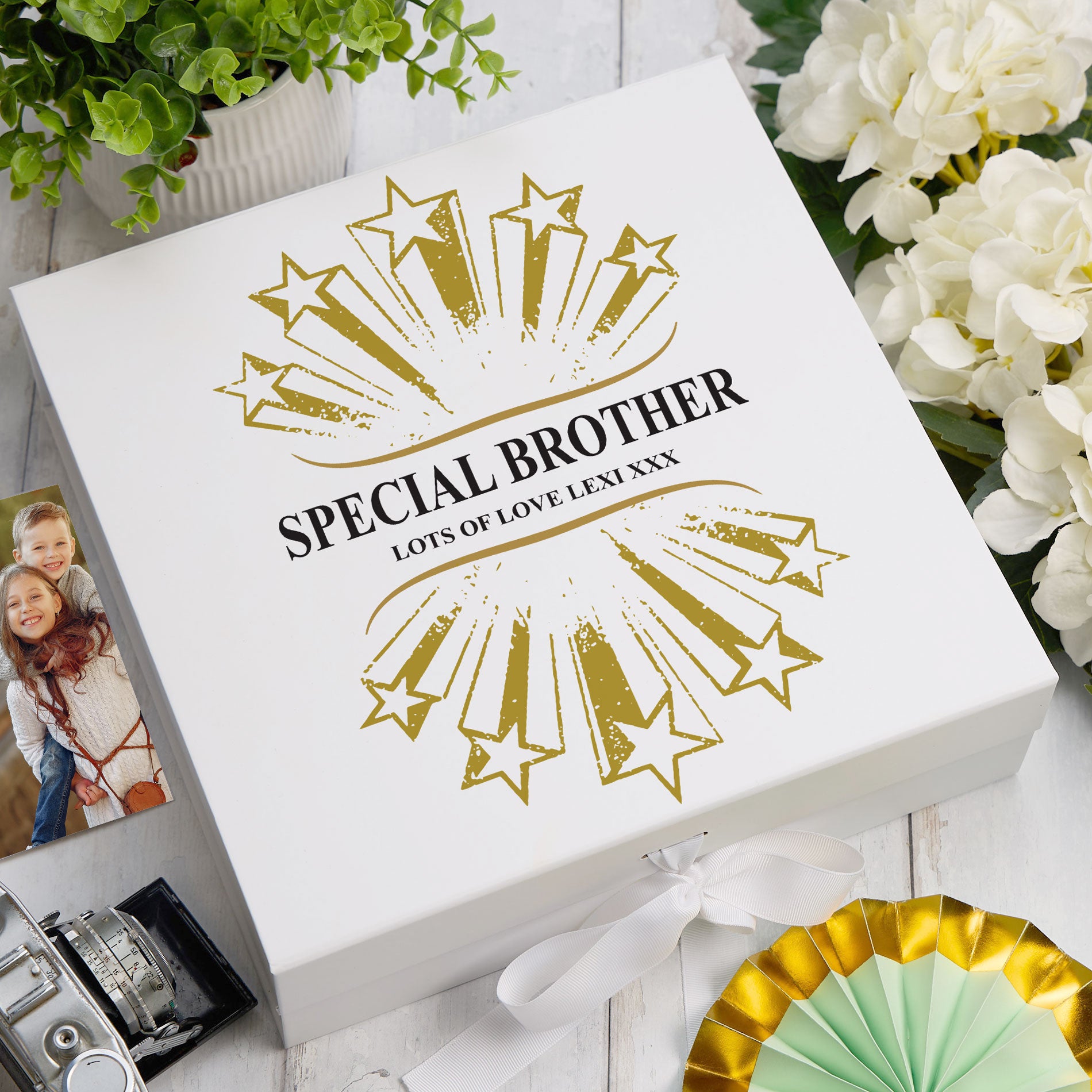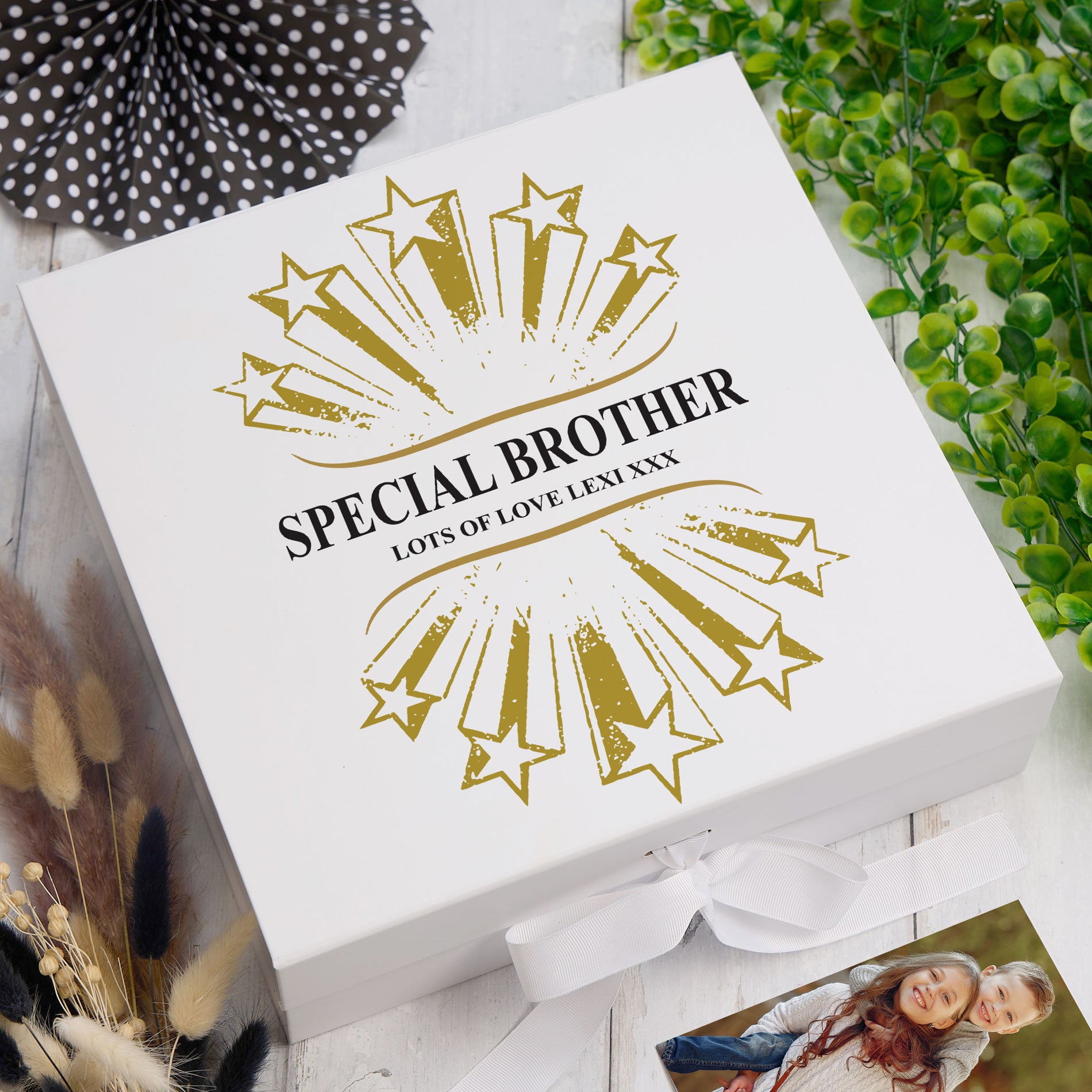 The personalised print on this luxury box is raised slightly to create a stunning embossed-style feature. The box itself is sturdy and durable - made from a luxurious 1200gsm white matt laminated rigid board. Available in two sizes and used as a gift box, as a memory box or as part of a hamper. Medium 17cm x 17cm x 8cm Large 30cm x 30cm x 9cm It can be used as a gift box, as a memory box or as part of a hamper.