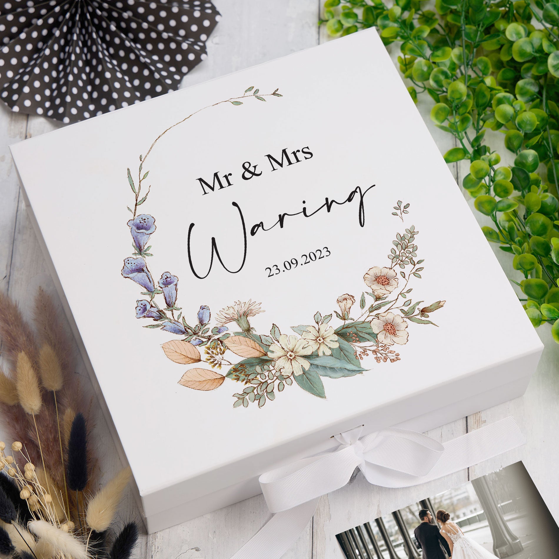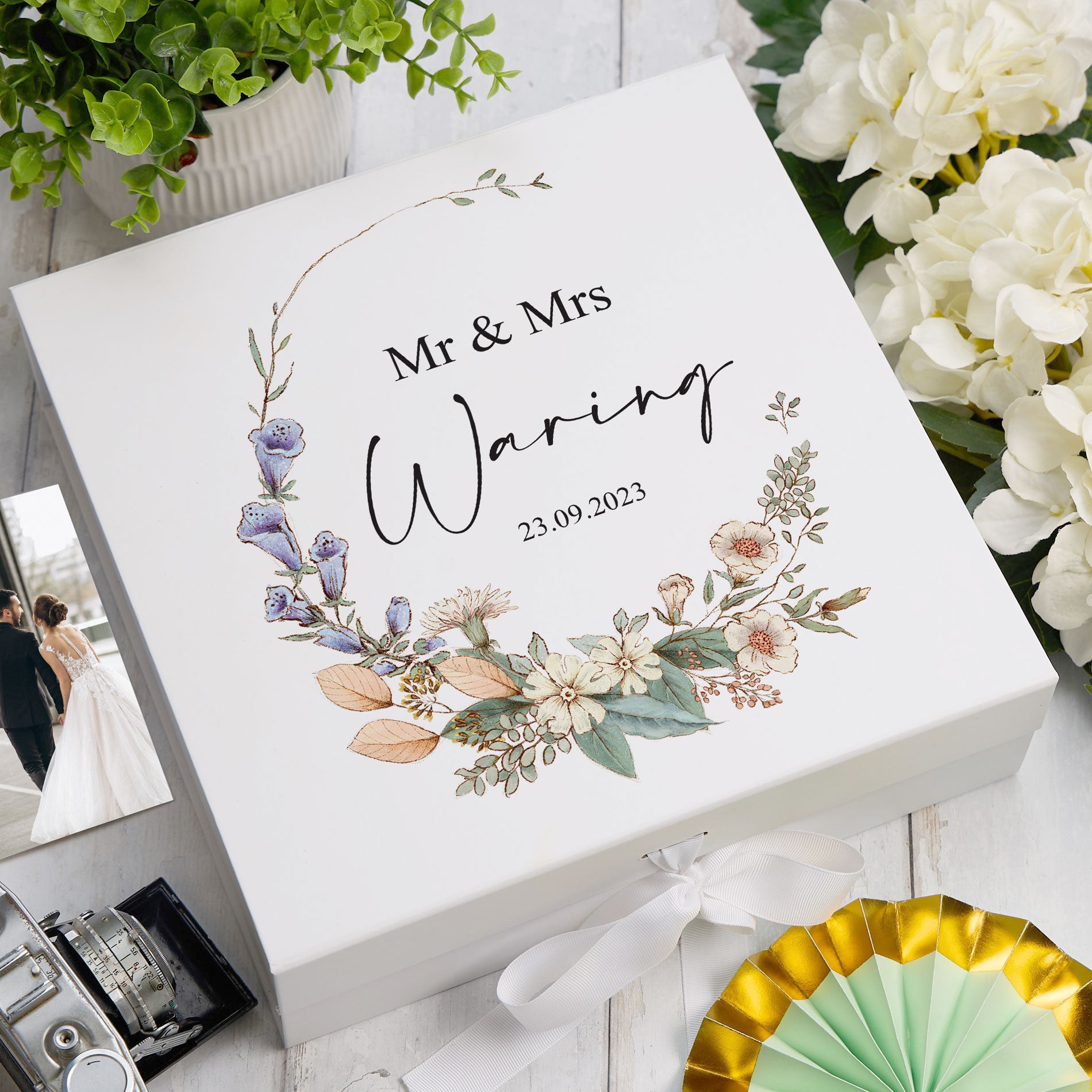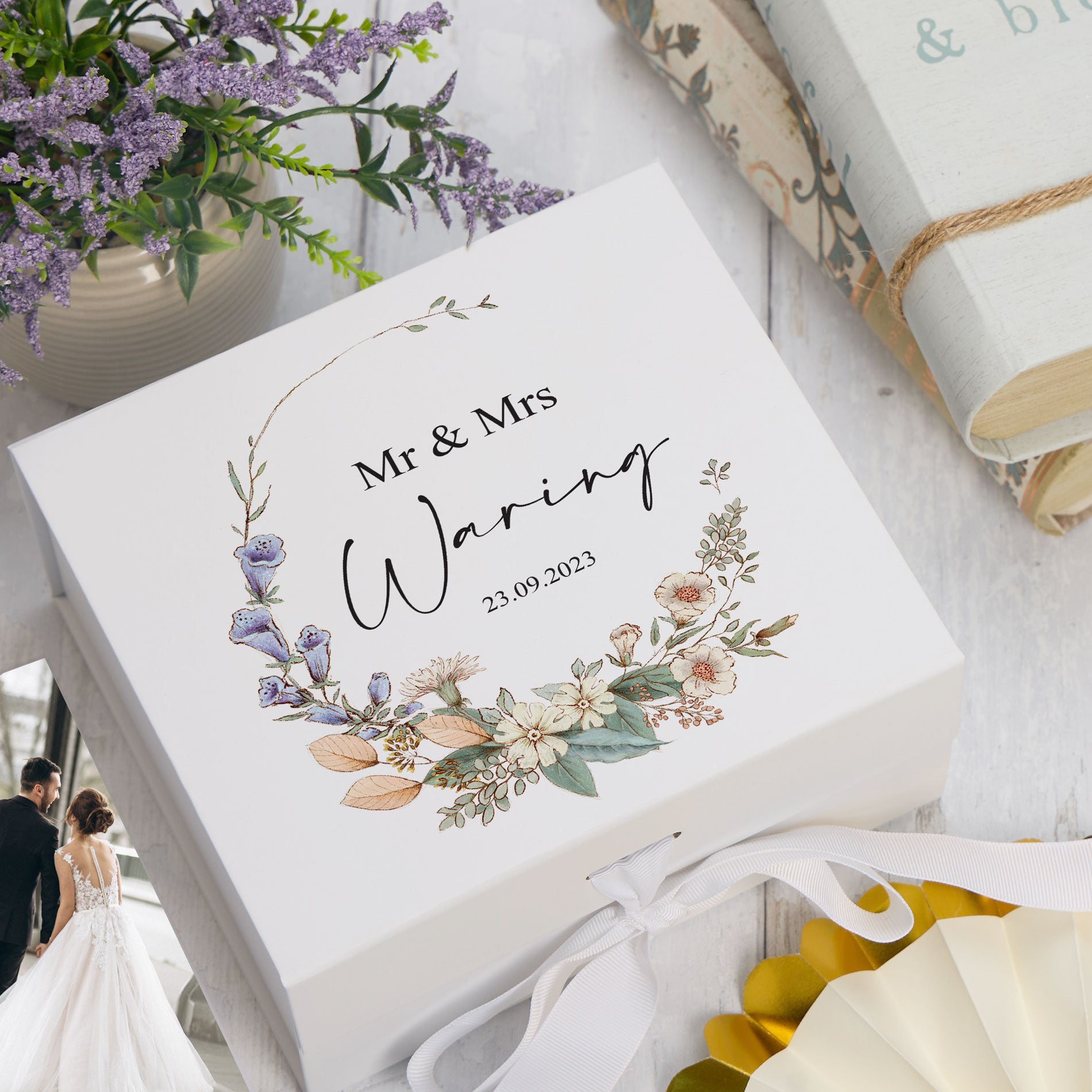 This personalised keepsake memory box, adorned with delicate wildflowers, offers a thoughtful way to store treasured mementos from a wedding day. Crafted to protect and celebrate special moments, it provides a beautiful and meaningful gift that helps preserve memories for years to come. Ideal for newlyweds looking to keep their wedding highlights safe in one elegant place.