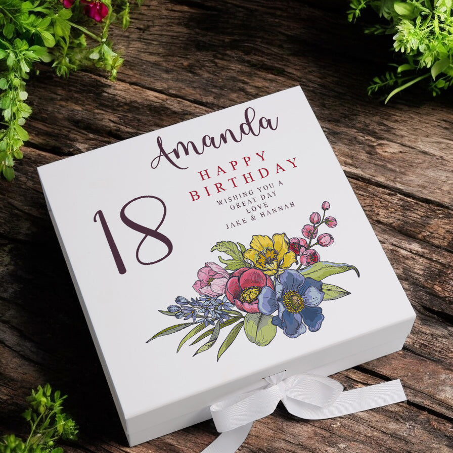 A premium keepsake box specifically designed for 18th birthdays, featuring a floral design and customizable sentiment. It...