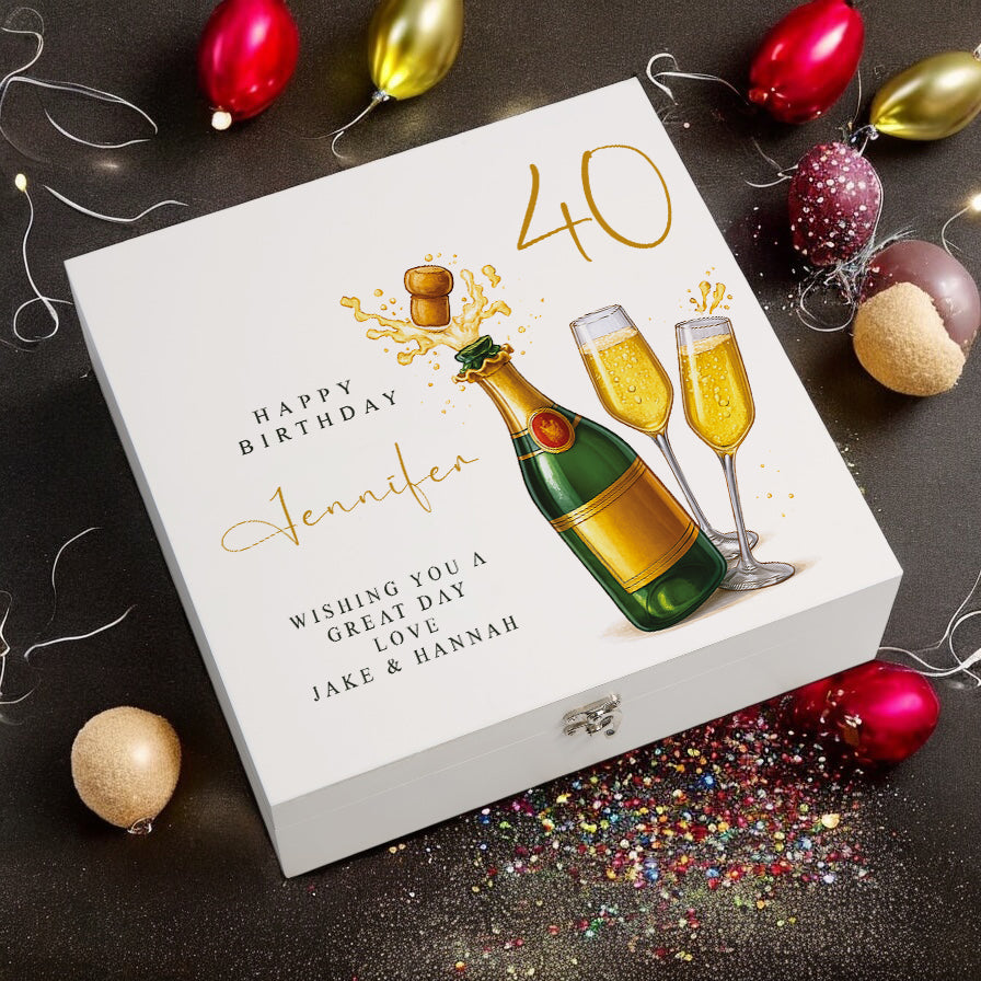 Personalised 40th Birthday Keepsake Box Customised With Champagne Bottle and Sentiment