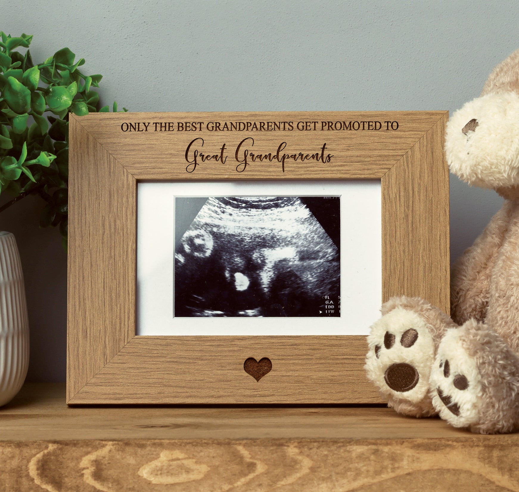 A lovely wooden frame to display that all important or memorable scan photo. The frame has an oak wood finish with the engraving of "Best grandparents get promoted to great grandparents" The insert in the frame is included and holds a hospital sized scan photo 4" x 3" There is a stand at the rear so will sit flat on any surface.