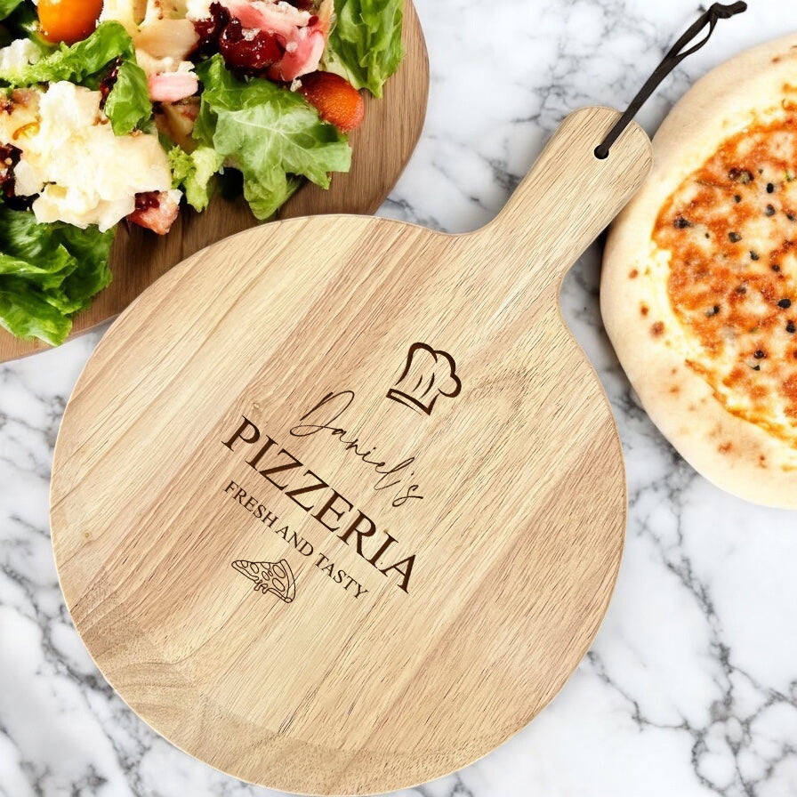 This personalised pizza serving board, measuring 40.5x30x1.2cm, is crafted from high-quality wood to provide a durable and attractive surface for serving your favourite pizzas. Its generous size accommodates a variety of pizza sizes, making it ideal for casual dinners or special occasions. Customisable with names, dates, or messages, it adds a thoughtful and unique touch, perfect for couples, new homeowners, birthdays or anniversary gifts. Combining practicality with personalised charm, this board enhances any pizza night experience while serving as a memorable keepsake.