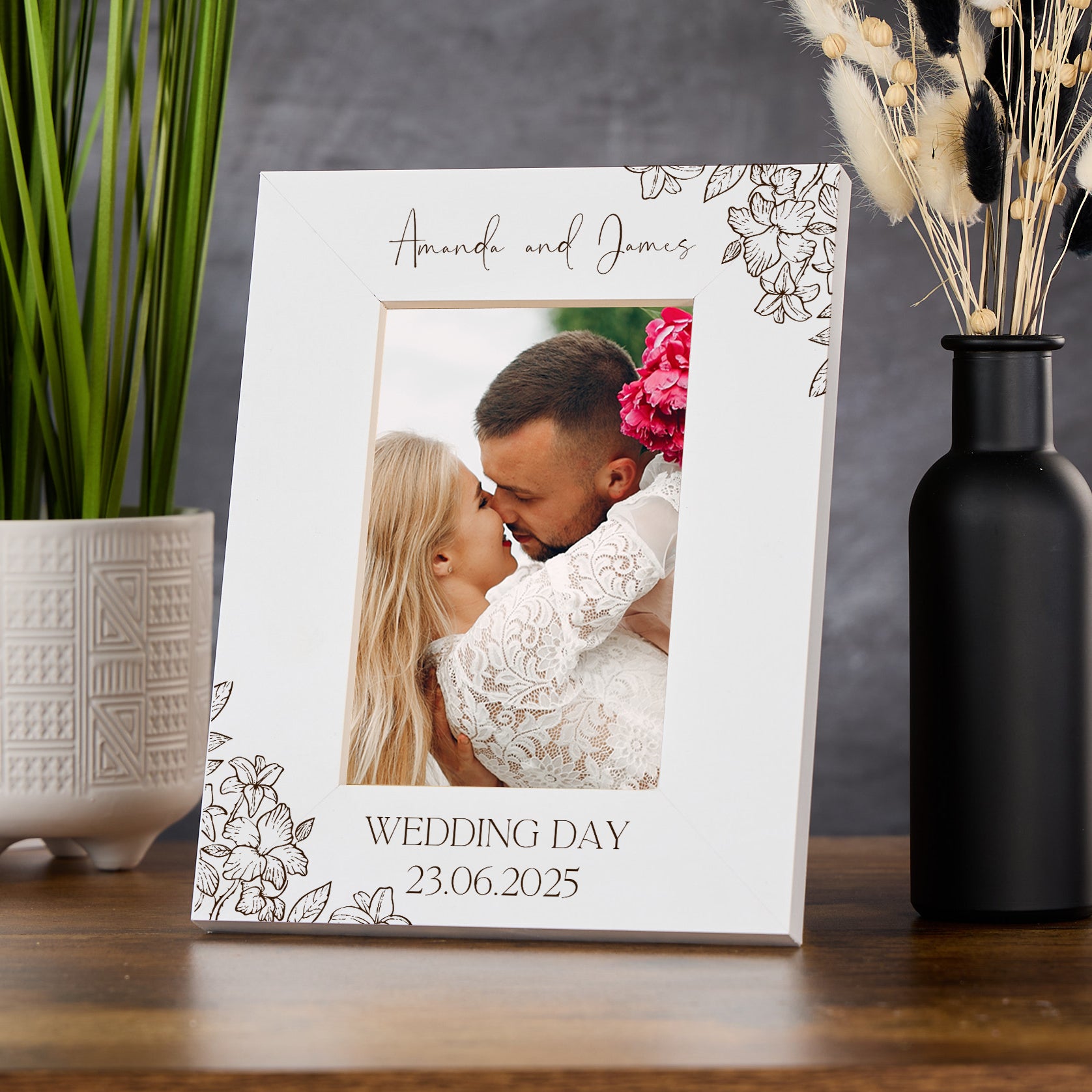 Personalised Wooden Engraved White Photo Frames Wedding Any Message With Orchid Flowers