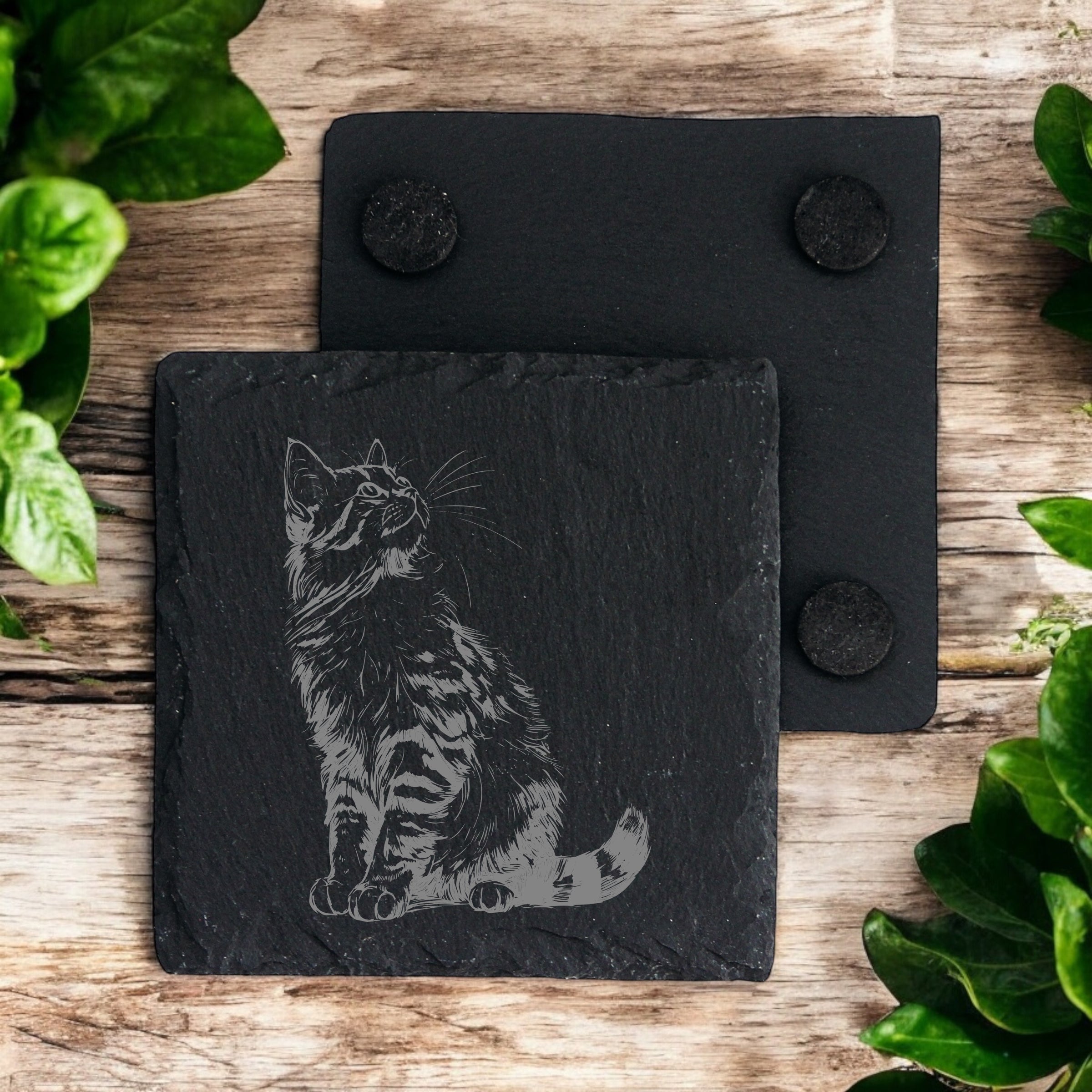 Set of 2 Cat Engraved Slate Stone Drink Coasters