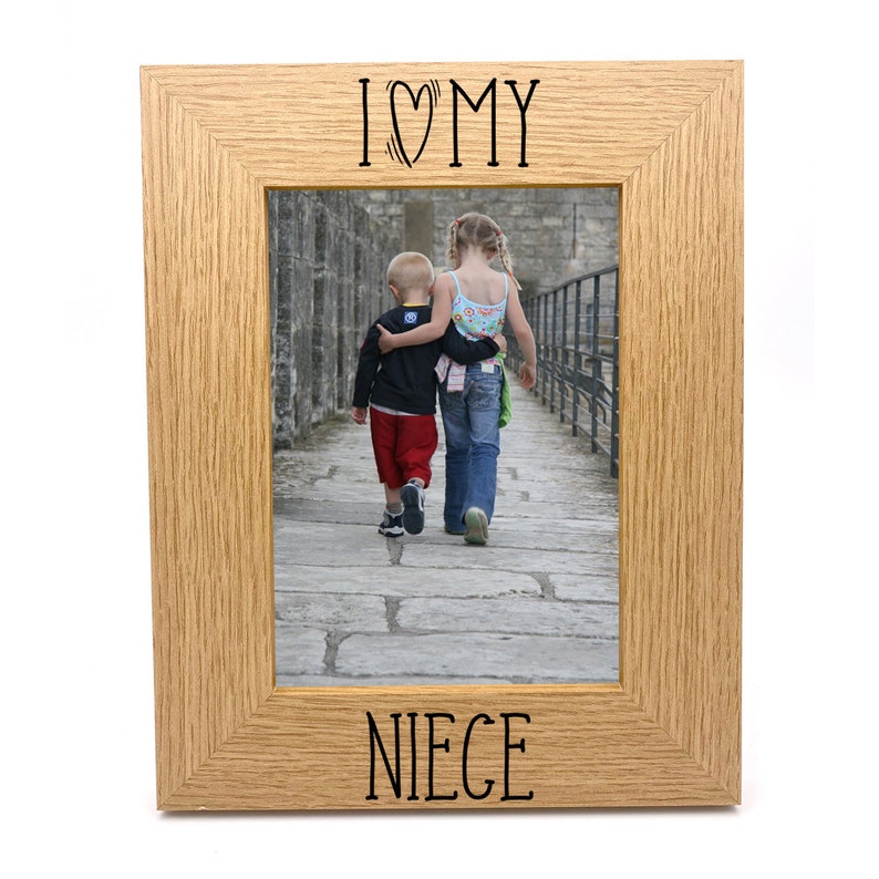 The frame has a oak wood finish with the engraving of "I love my" on top while underneath you have "nephew" Please select the photo frame size you require, the sizes are for the photo size. There is a stand at the rear so will sit flat on any surface