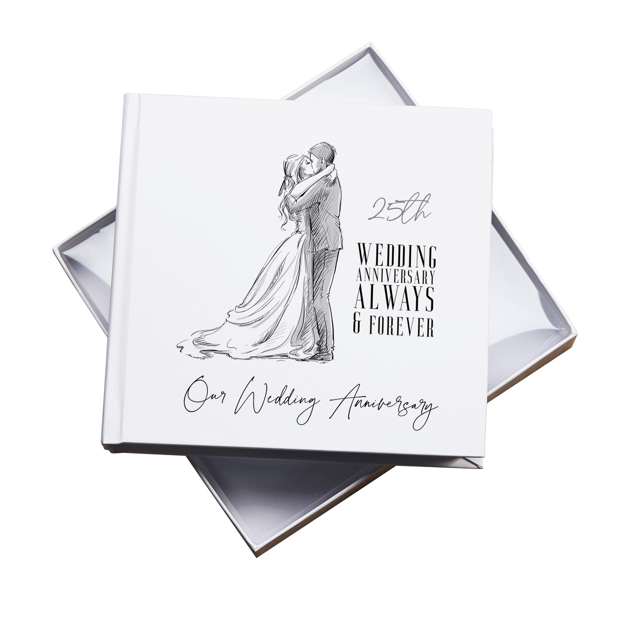 This elegant 25th Wedding Anniversary Photo Album is perfect for preserving special memories. It holds 50 photos sized 6" x 4", beautifully presented in a white gift box. Celebrate your love and milestone with this timeless keepsake, with a beautifully illustrated couple, alongside elegant typography. This pack comes in a single box of five albums