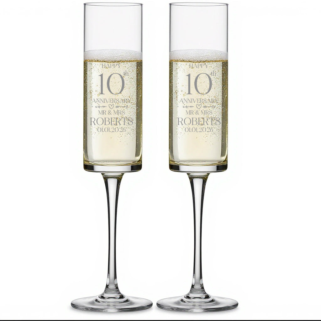 This exquisite set includes two modern and elegantly designed personalised tall champagne prosecco glasses, ideal for commemorating a 10th anniversary. Crafted with attention to detail, each glass measures 23cm in height and holds 200 ml, offering the perfect balance for sparkling celebrations. The personalised touch adds a unique and meaningful element, making it a thoughtful gift that blends style with sentiment. Whether raising a toast or displaying them as cherished keepsakes, these glasses bring sophistication and lasting memories to any special occasion.