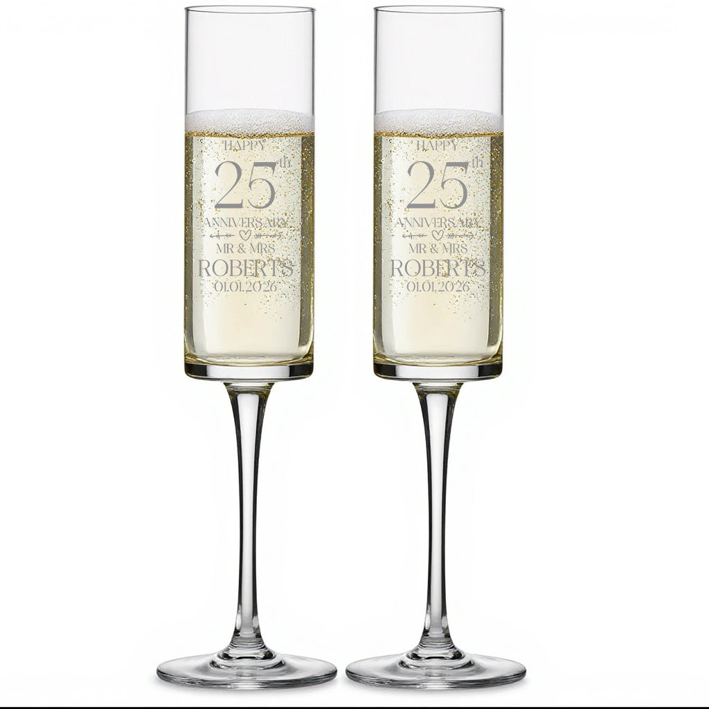 This exquisite set includes two modern and elegantly designed personalised tall champagne prosecco glasses, ideal for commemorating a 25th anniversary. Crafted with attention to detail, each glass measures 23cm in height and holds 200 ml, offering the perfect balance for sparkling celebrations. The personalised touch adds a unique and meaningful element, making it a thoughtful gift that blends style with sentiment. Whether raising a toast or displaying them as cherished keepsakes, these glasses bring sophistication and lasting memories to any special occasion.