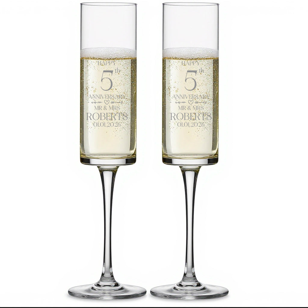 This exquisite set includes two modern and elegantly designed personalised tall champagne prosecco glasses, ideal for commemorating a 5th anniversary. Crafted with attention to detail, each glass measures 23cm in height and holds 200 ml, offering the perfect balance for sparkling celebrations. The personalised touch adds a unique and meaningful element, making it a thoughtful gift that blends style with sentiment. Whether raising a toast or displaying them as cherished keepsakes, these glasses bring sophistication and lasting memories to any special occasion.