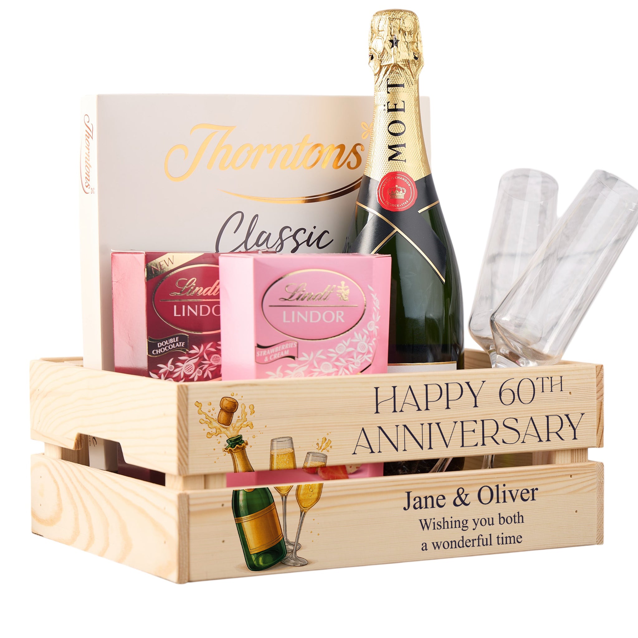 Personalised 60th Anniversary Crate Box Gift For Couple With Champagne Design
