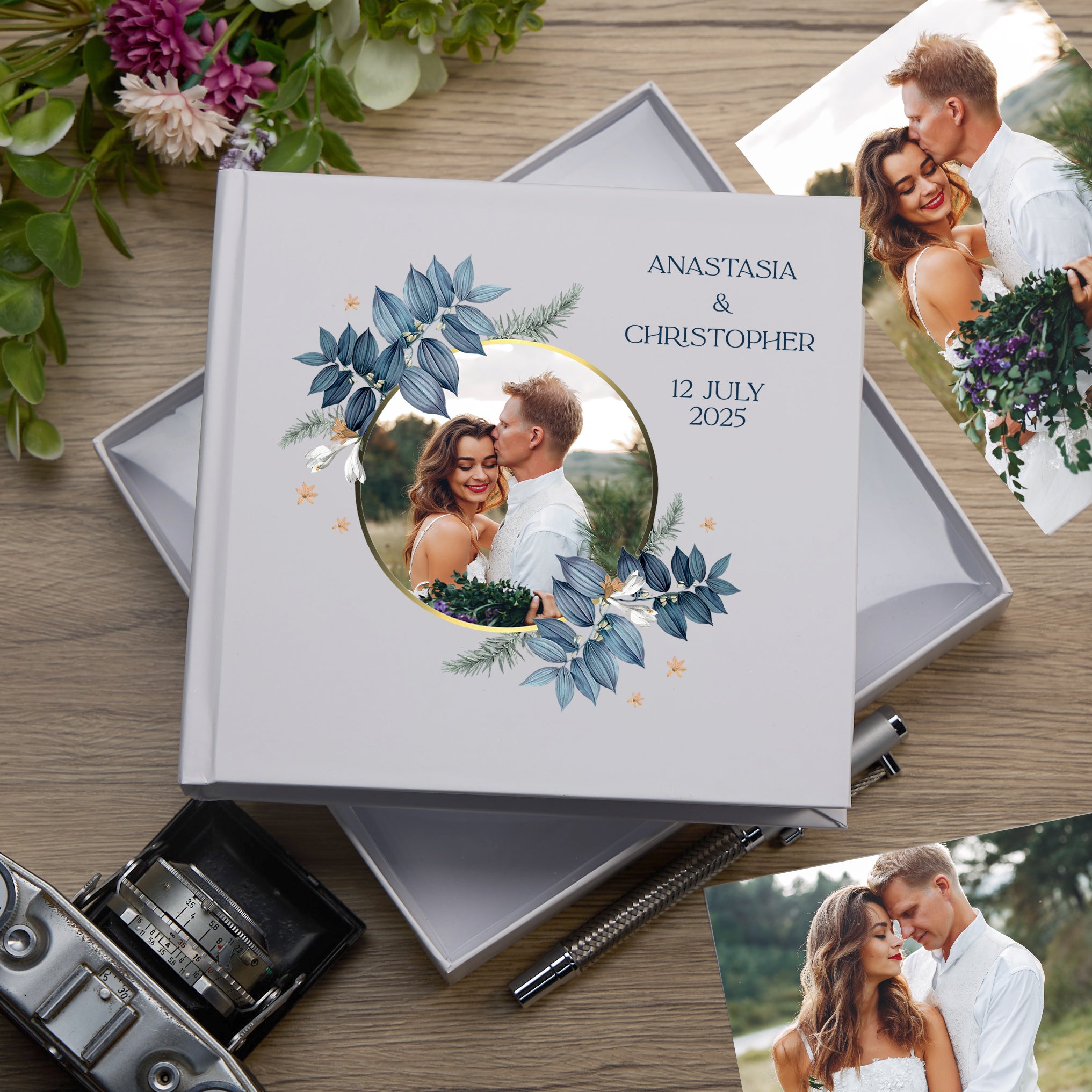 Bespoke Matrimonial Photographic Portfolio in pristine white featuring customizable image integration, expertly crafted for nuptial or betrothal commemoration. This tailored keepsake offers sophisticated preservation of significant relationship milestones through personalised visual documentation, ideal for presenting to couples celebrating their commitment ceremony or formal announcement of intended marriage.