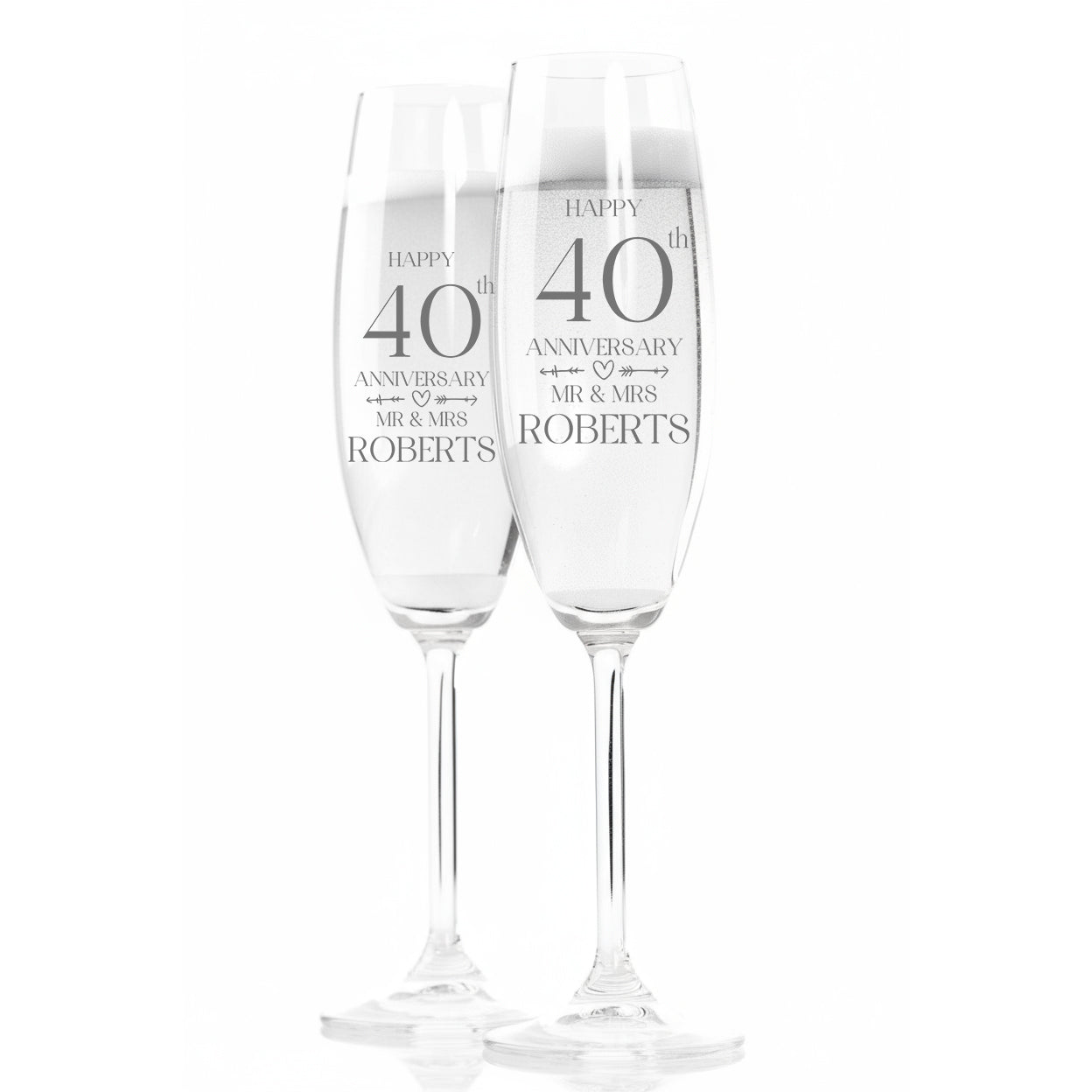 Mark your 40th wedding anniversary with this personalized engraved champagne glass set, expertly crafted to enhance your celebration with elegance and sentiment. Each glass is carefully etched with your chosen details, creating a timeless keepsake that captures the significance of this milestone. Ideal for toasting your shared memories, this set combines quality craftsmanship with a personal touch, making it a cherished addition to your special day and a beautiful reminder of your enduring bond.