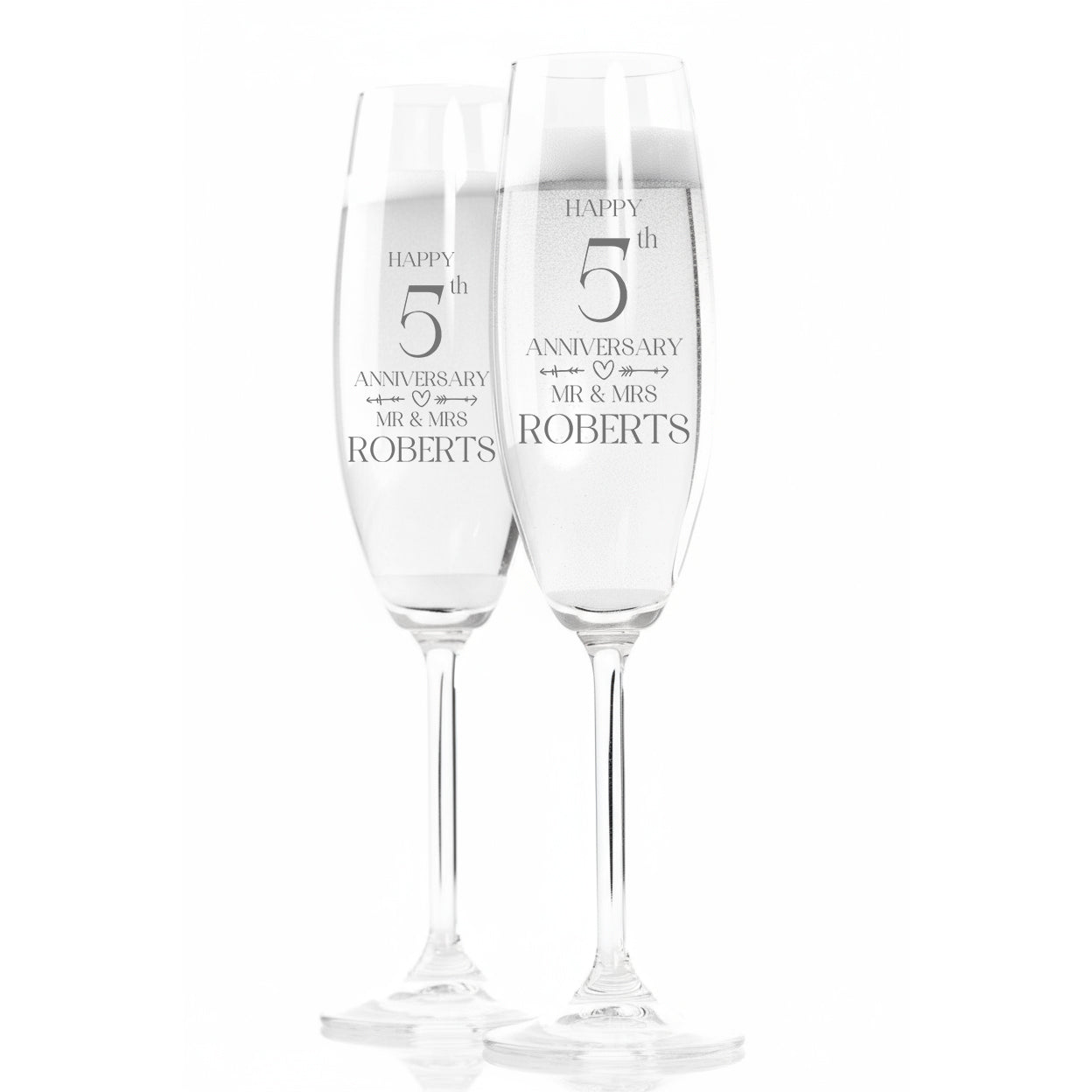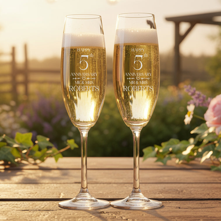 Mark your 5th wedding anniversary with this personalized engraved champagne glass set, expertly crafted to enhance your celebration with elegance and sentiment. Each glass is carefully etched with your chosen details, creating a timeless keepsake that captures the significance of this milestone. Ideal for toasting your shared memories, this set combines quality craftsmanship with a personal touch, making it a cherished addition to your special day and a beautiful reminder of your enduring bond.