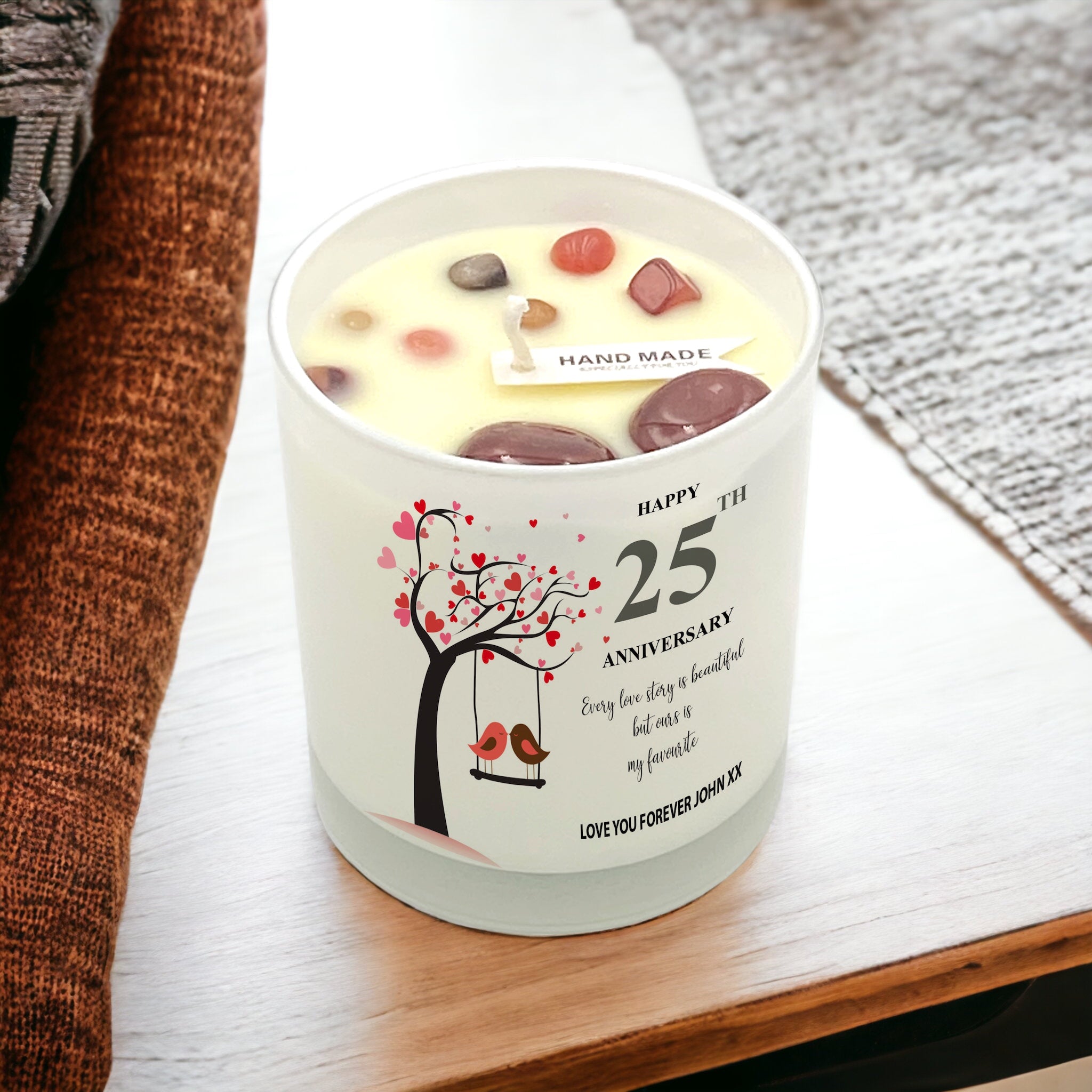 This candle is a luxurious and thoughtful way to commemorate a special occasion. It's handmade with meticulous attention to detail that lasts up to 80 hours. No detail is spared in celebrating the 25th anniversary.