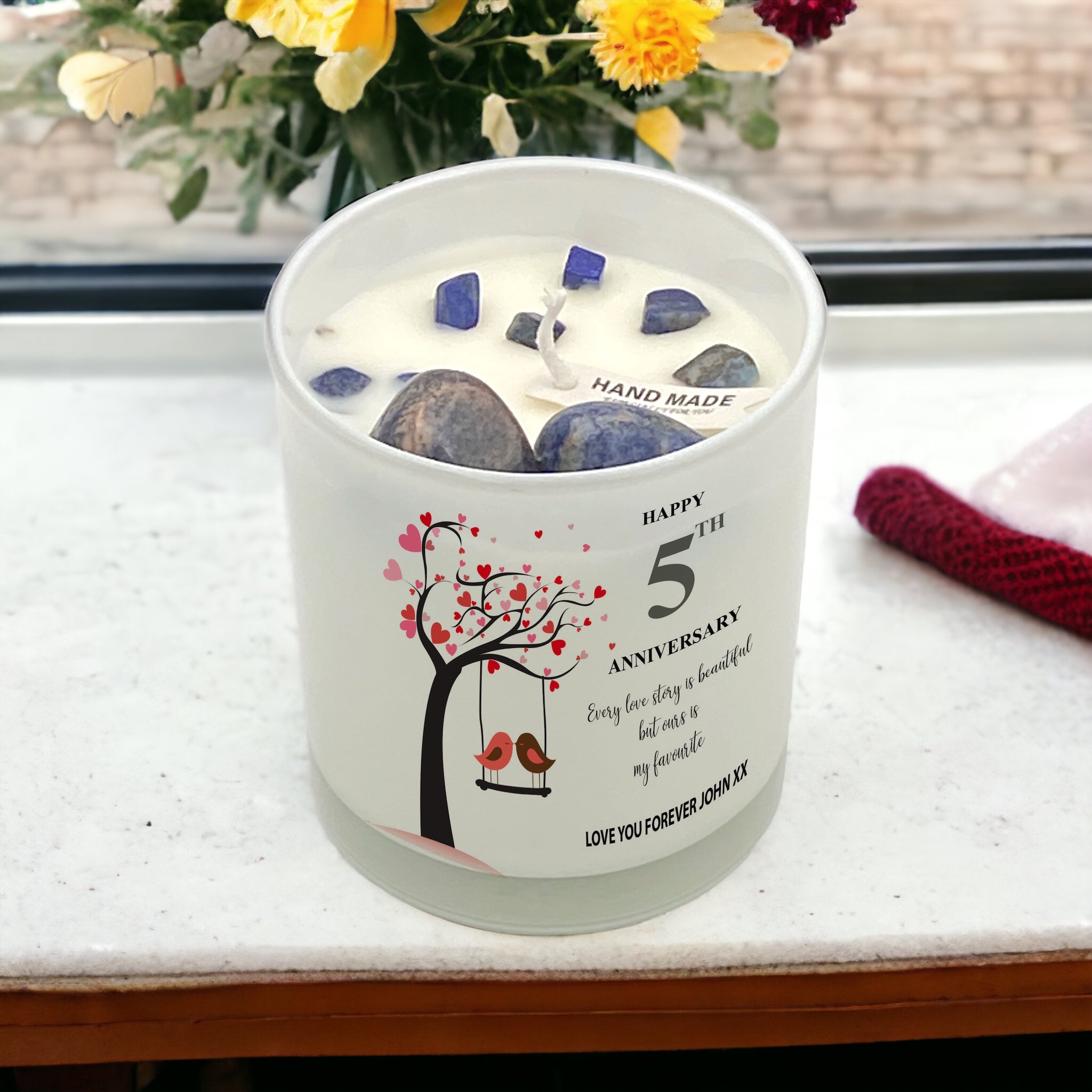 This candle is a luxurious and thoughtful way to commemorate a special occasion. It's handmade with meticulous attention to detail that lasts up to 80 hours. No detail is spared in celebrating the 5th anniversary.