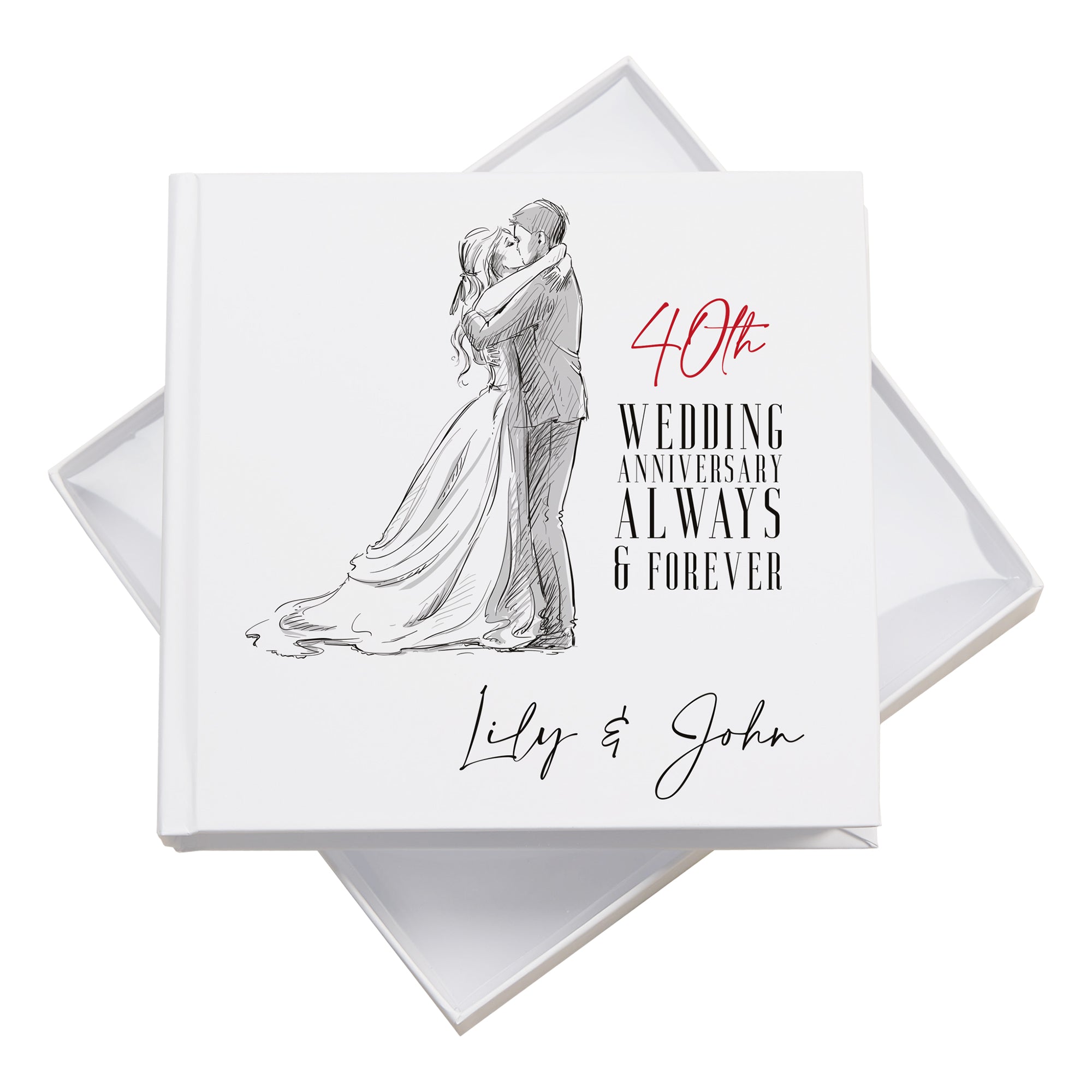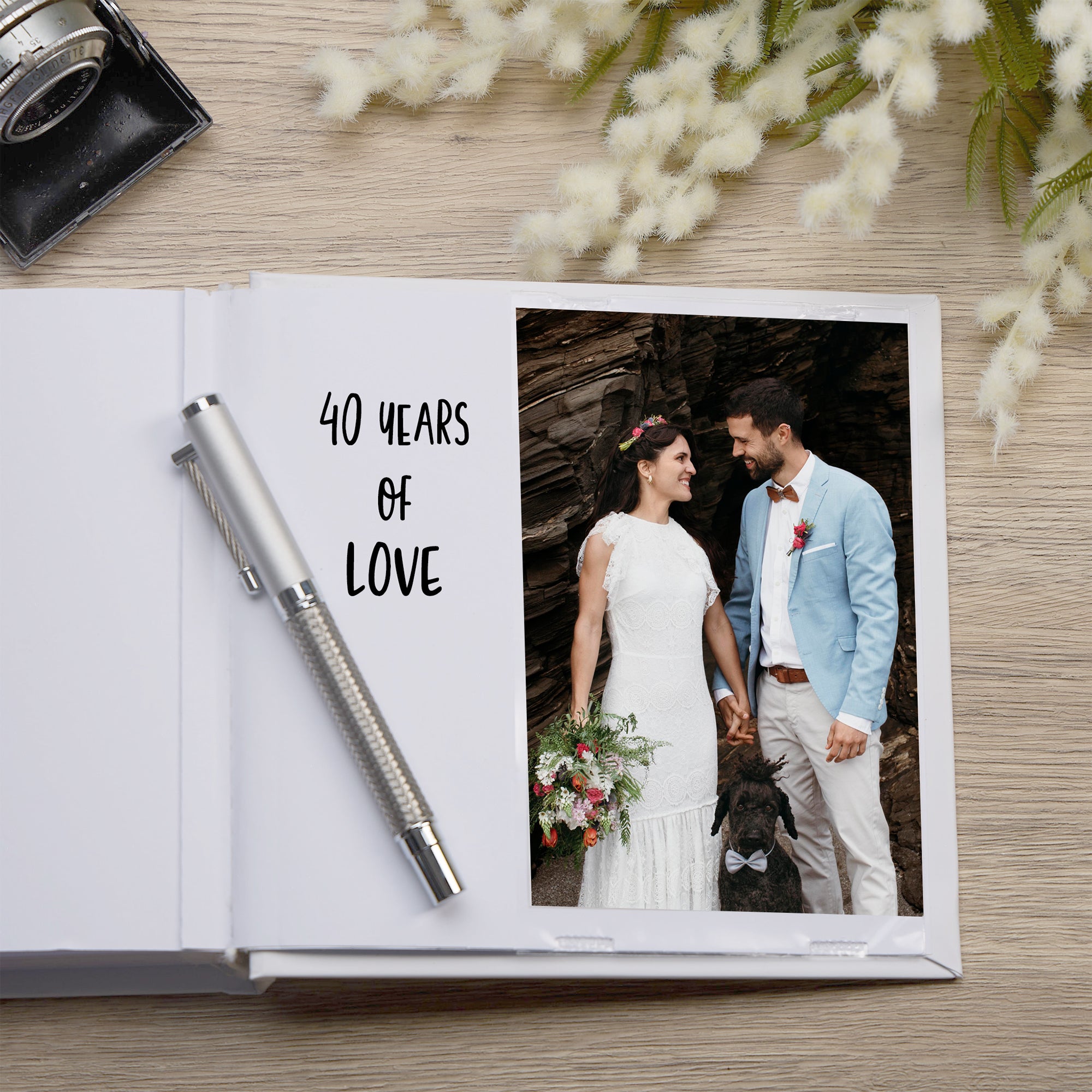 This beautifully crafted album features custom personalisation on the cover, allowing you to add the couple’s names for a truly unique and meaningful touch. It accommodates 50 slip-in 4" x 6" photos, each with dedicated space beside for handwritten notes or special memories, helping to tell the story of a remarkable marriage. Measuring approximately 18.5cm by 19.5cm, the album offers an ideal balance of size and capacity to preserve cherished moments. Supplied in an elegant box, it makes a timeless keepsake gift that honours four decades of love and commitment.