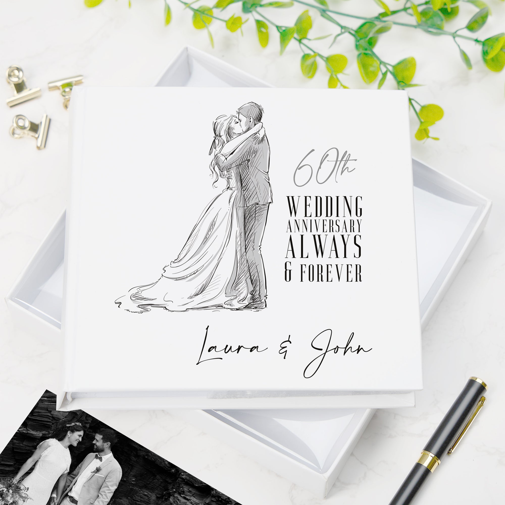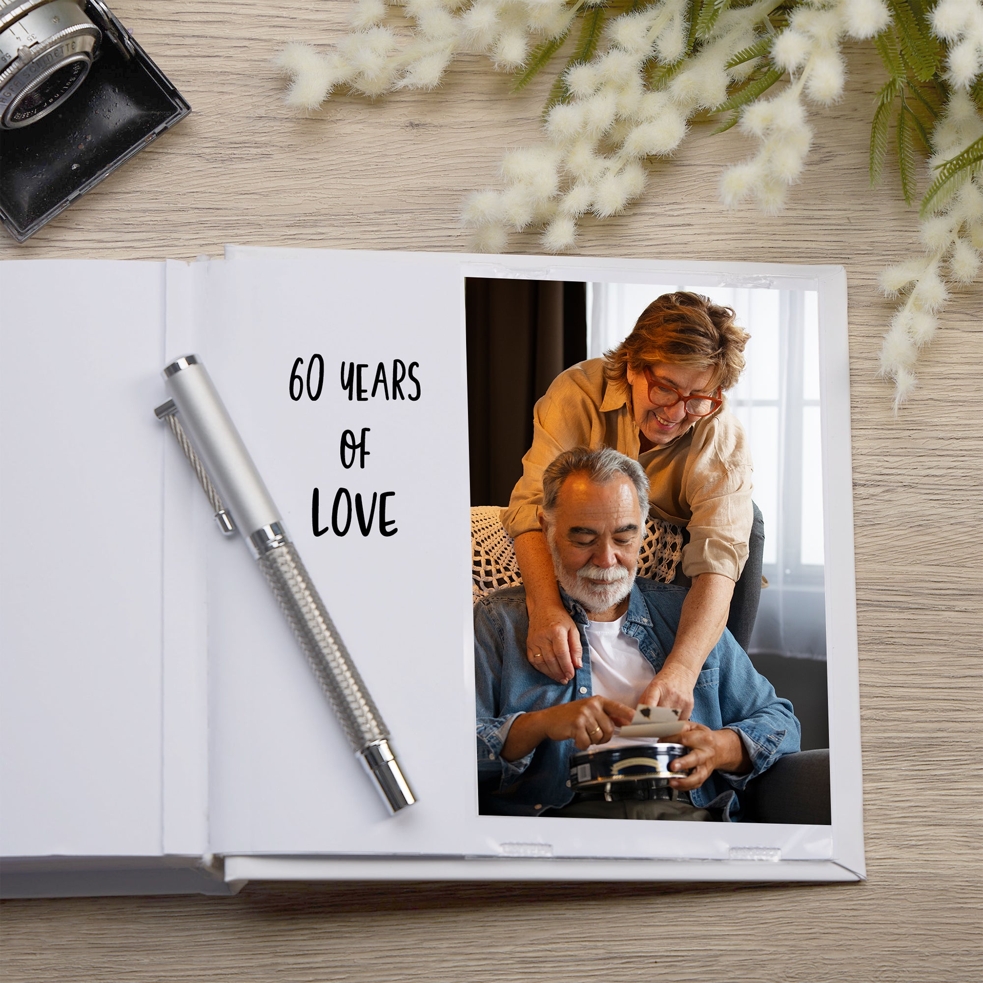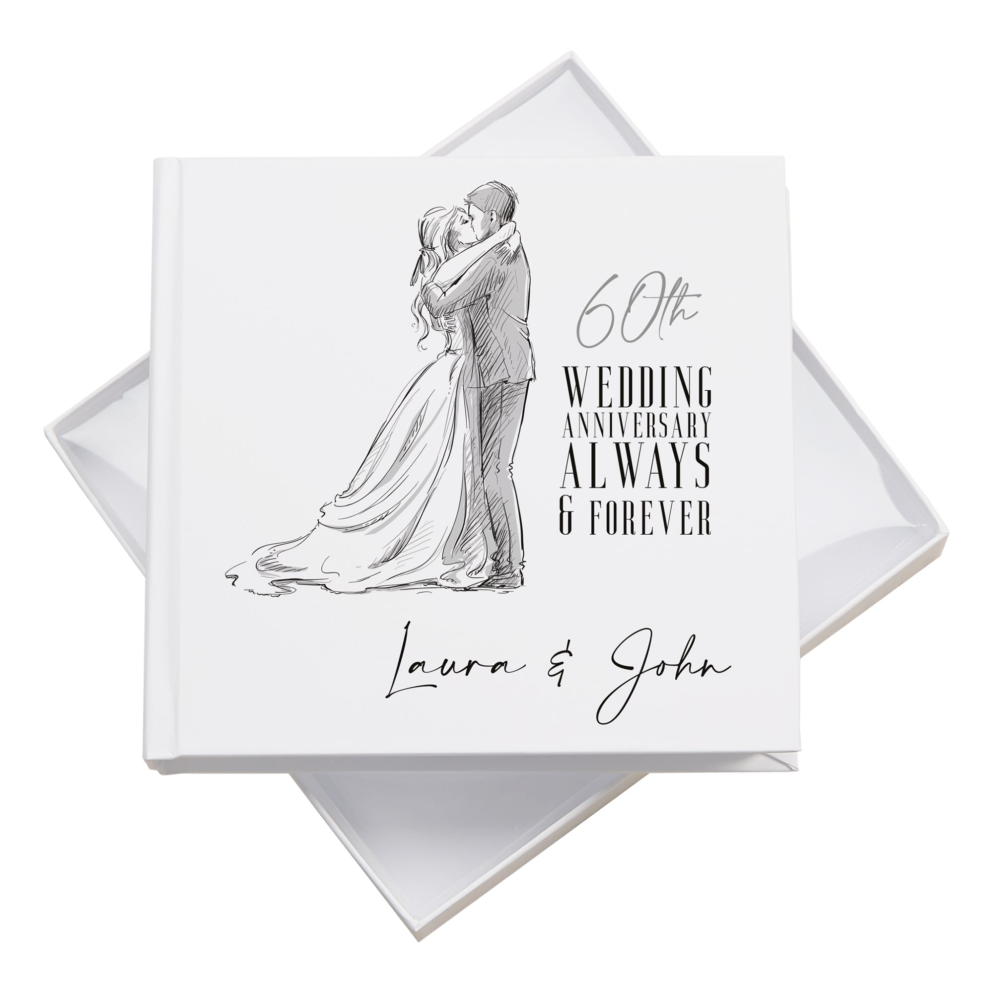 This beautifully crafted album features custom personalisation on the cover, allowing you to add the couple’s names for a truly unique and meaningful touch. It accommodates 50 slip-in 4" x 6" photos, each with dedicated space beside for handwritten notes or special memories, helping to tell the story of a remarkable marriage. Measuring approximately 18.5cm by 19.5cm, the album offers an ideal balance of size and capacity to preserve cherished moments. Supplied in an elegant box, it makes a timeless keepsake gift that honours six decades of love and commitment.