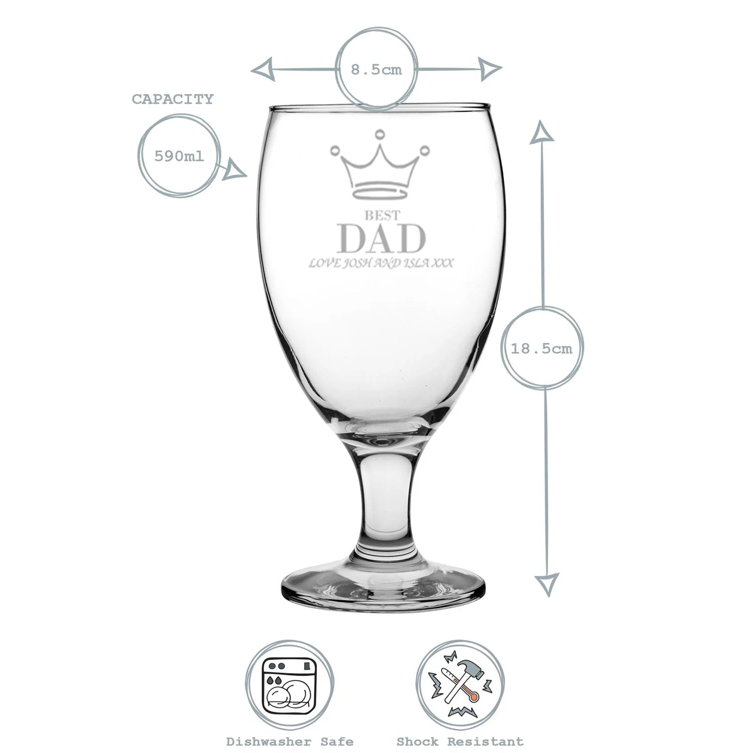 Indulge in the ultimate beer drinking experience with our Personalised Dad Birthday Craft Beer Cider Ale Glass. Designed with a classic 'Snifter' glass shape, this glass is expertly crafted to enhance the aromatics and flavours of your favourite craft beers and ales. Made from high-quality glass, it's perfect for both home and professional use, and its exceptional clarity will beautifully showcase the rich colours of your beverage. With dimensions of Width: 8.5cm, Depth: 8.5cm, Height: 19cm, and a capacity of 1 Pint, it's the perfect size for your drinking pleasure. Plus, with rolled rims, this glass provides added resistance against chipping if knocked or dropped, ensuring its longevity and your continuous enjoyment.