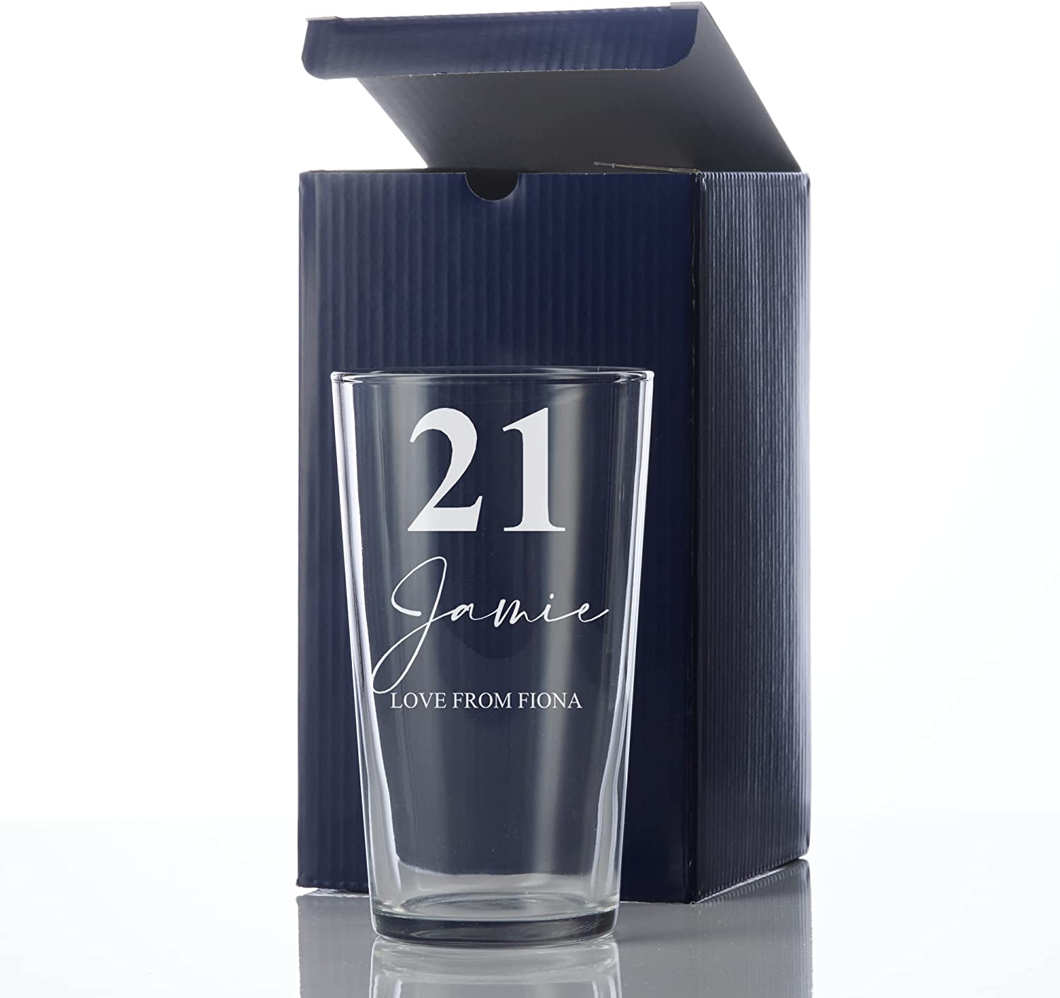 An engraved perfect pint glass for that someone celebrating their birthday. The glass comes engraved with the age 21, name and short sentiment. Marked with our laser engraving system, your personalised message will be permanently inscribed on the glass, making a lasting, sentimental gift that will be treasured forever. This glass holds up to 1 pint, or 568ml/20oz, and measures 169mm high x 85mm wide. This is a toughened glass, designed to be robust and sturdy. Your glass will arrive in a stunning gift box, ready to give straight to the recipient. We recommend washing your glass as soon as you receive it. This glass is dishwasher safe, and as the engraving is permanent, you won't have to worry about washing your personalised message off.