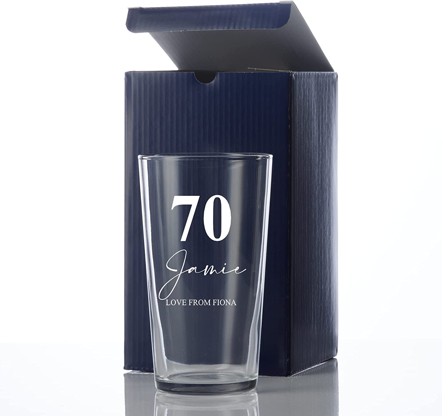An engraved perfect pint glass for that someone celebrating their birthday. The glass comes engraved with the age, name and short sentiment. Marked with our laser engraving system, your personalised message will be permanently inscribed on the glass, making a lasting, sentimental gift that will be treasured forever. This glass holds up to 568ml/20oz, and measures 169mm high x 85mm wide. This is a toughened glass, designed to be robust and sturdy. Your glass will arrive in a stunning gift box, ready to give straight to the recipient. We recommend washing your glass as soon as you receive it. This glass is dishwasher safe, and as the engraving is permanent, you won't have to worry about washing your personalised message off. Please note the engraving holds no colour.