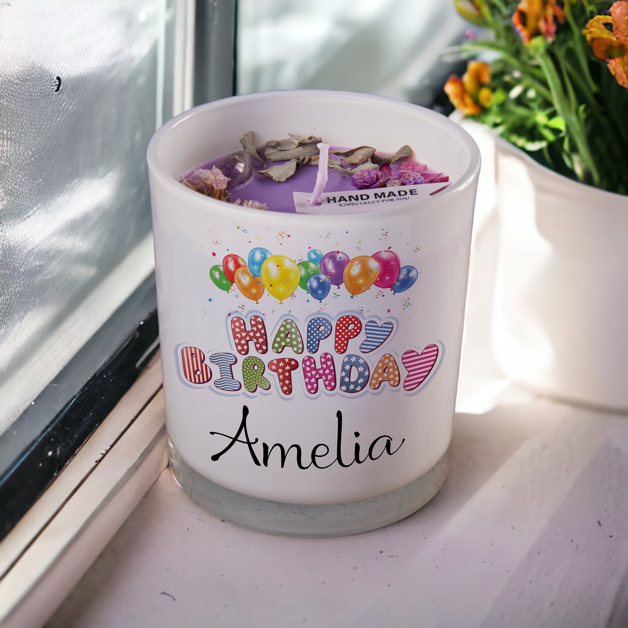 A beautiful candle with embellishments decorating the candle, making that ever so special. This lovely candle comes boxed and personalised for that special occasion. The candle measures 8cm x 8cmHandmade with a burn time of approx 80 hours weighing 640g