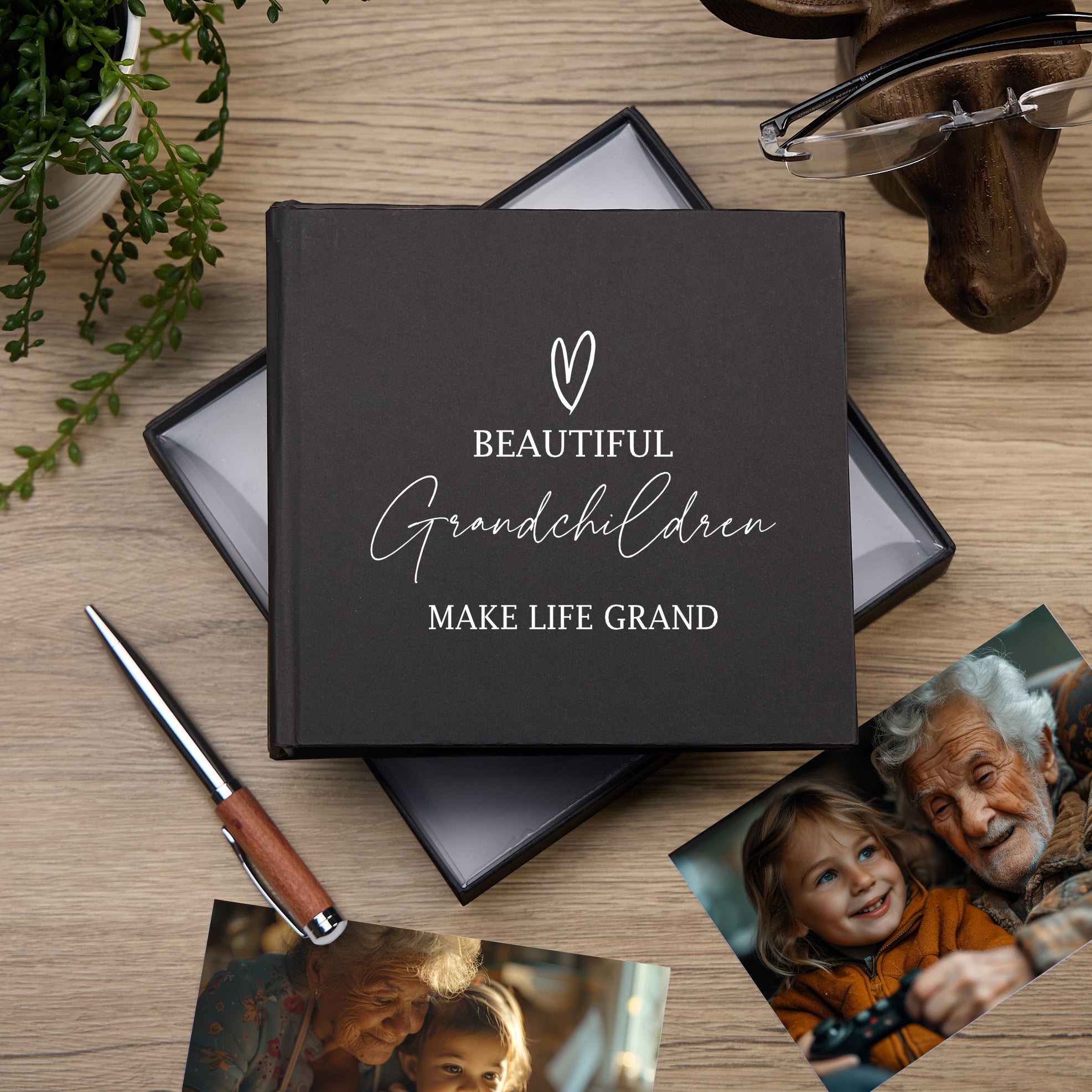 Designed with both practicality and sentimentality in mind, the Grandchildren Memories Black Photo Picture Album boasts slip-in pages and ample space for writing next to each photo, providing the perfect way to memorialize your cherished memories. Measuring approximately 18.5cm by 19.5cm and arriving in a beautiful gift box, this album is the perfect keepsake for any special occasion and a thoughtful gift for loved ones.