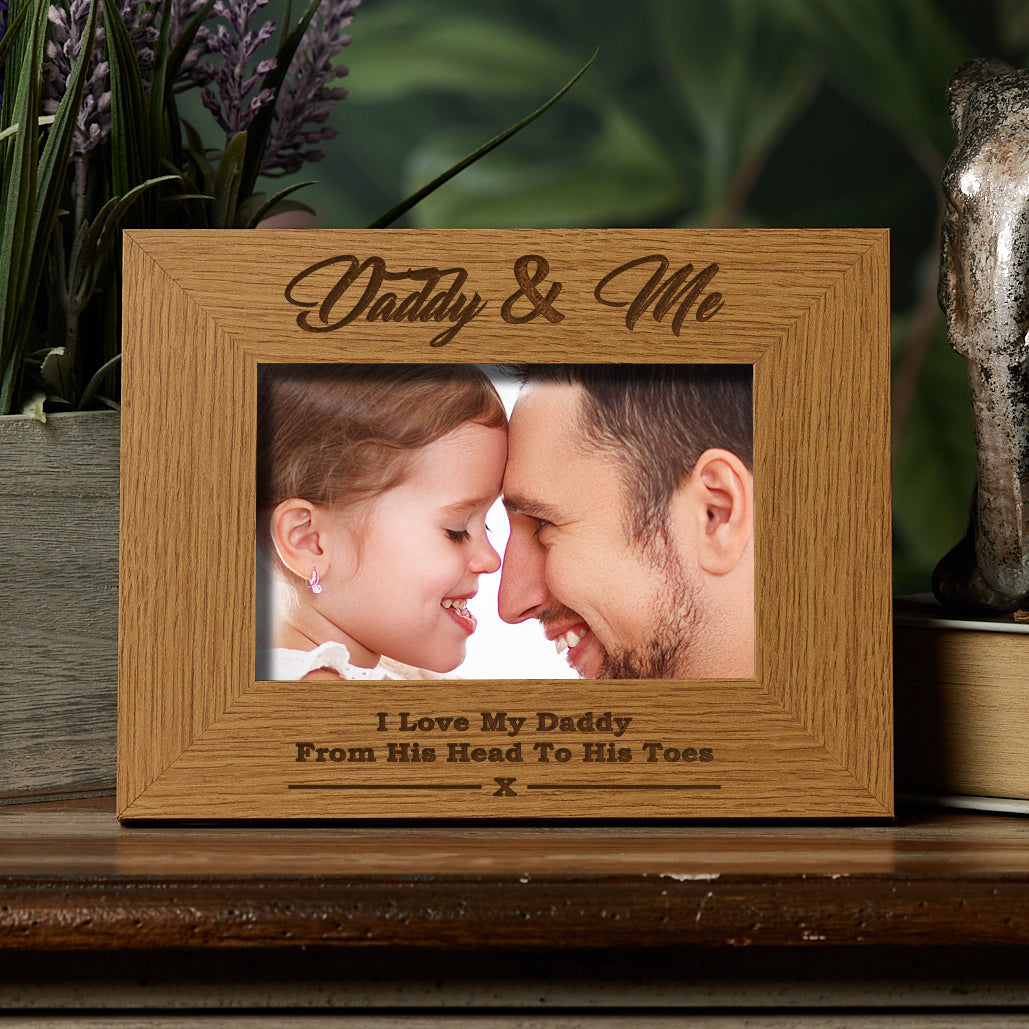 The frame has a solid wood finish with the engraving of "Daddy and Me" and "I love my daddy from his head to his toes" on the bottom part of the frame. Please select the photo frame size you require, the sizes are for the photo size. There is a stand at the rear so will sit flat on any surface