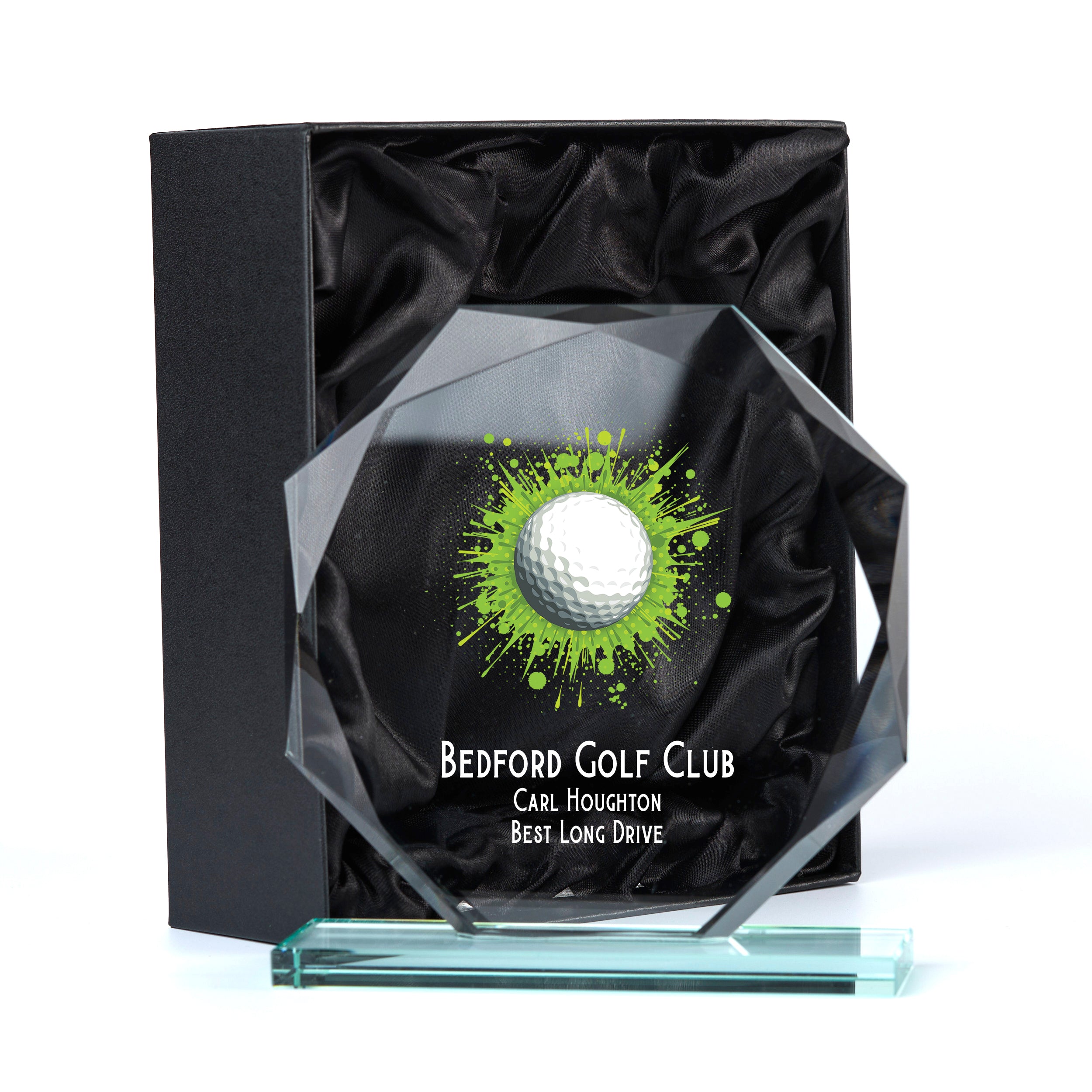Crafted from high-quality jade glass, this 15cm Golf trophy is the ideal way to commemorate any special event. Arriving in a luxurious silk-lined gift box, this personalised award is an impressive and thoughtful present. Colour UV Printed ensures that the recipient's achievements will be forever immortalized on this distinguished trophy.